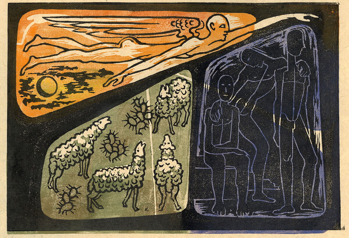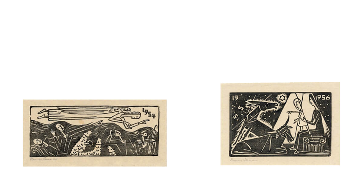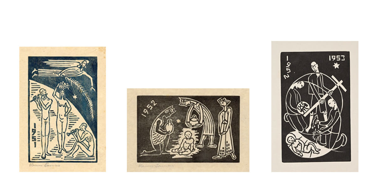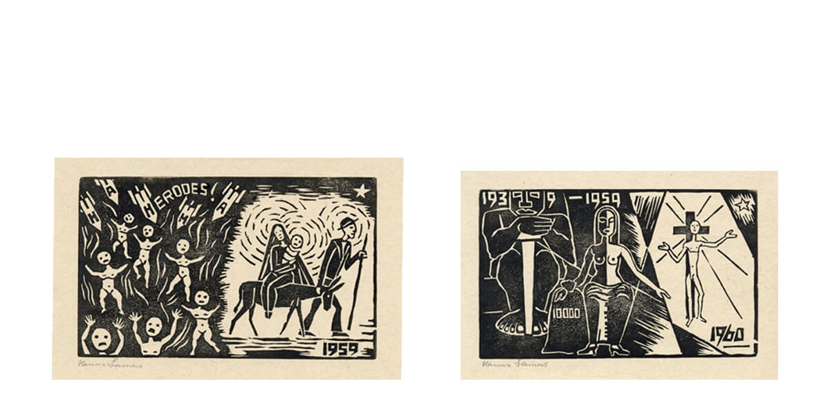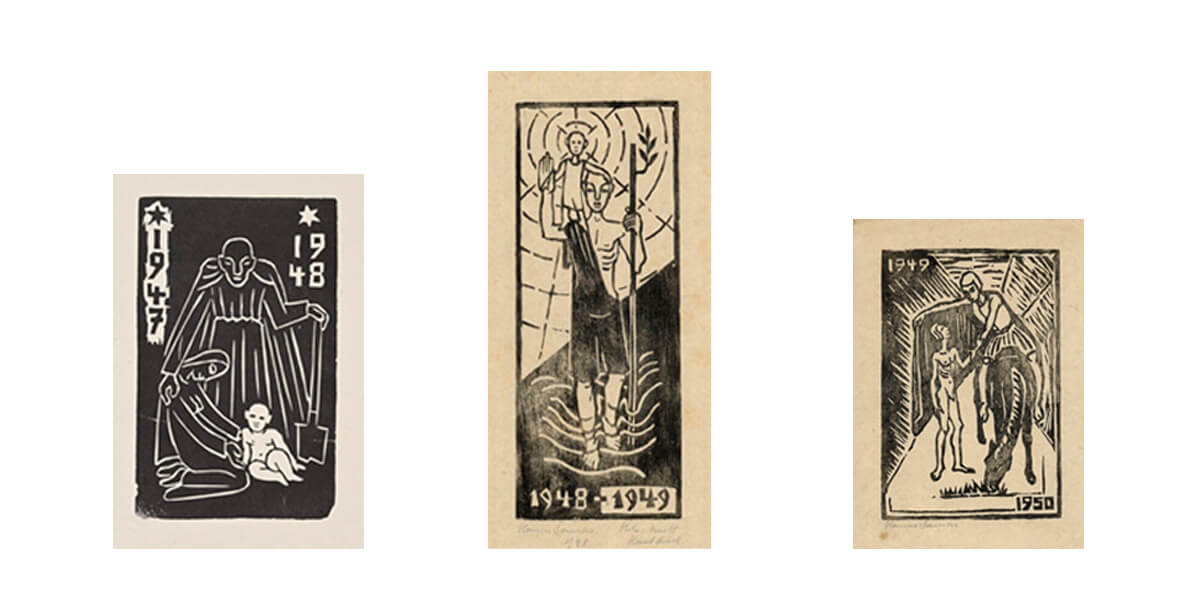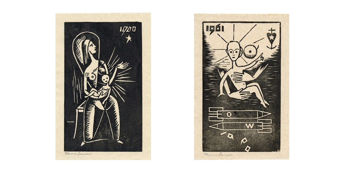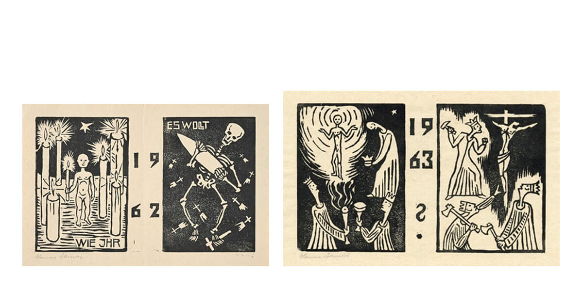 Zum Jahreswechsel gestaltete Hanns Lamers ab 1947 Holzschnitte, die seine Hoffnung und seinen Wunsch nach Frieden ausdrückten. Zwei Weltkriege haben ihn geprägt. In den Ersten Weltkrieg zog er als Zwanzigjähriger und mit 42 musste er nochmals Soldat werden, sechs Jahre lang. Mit einem Hörschaden kam er 1945 aus Russland zurück.