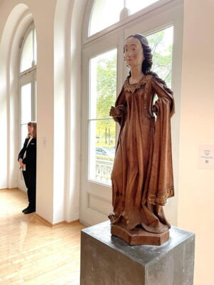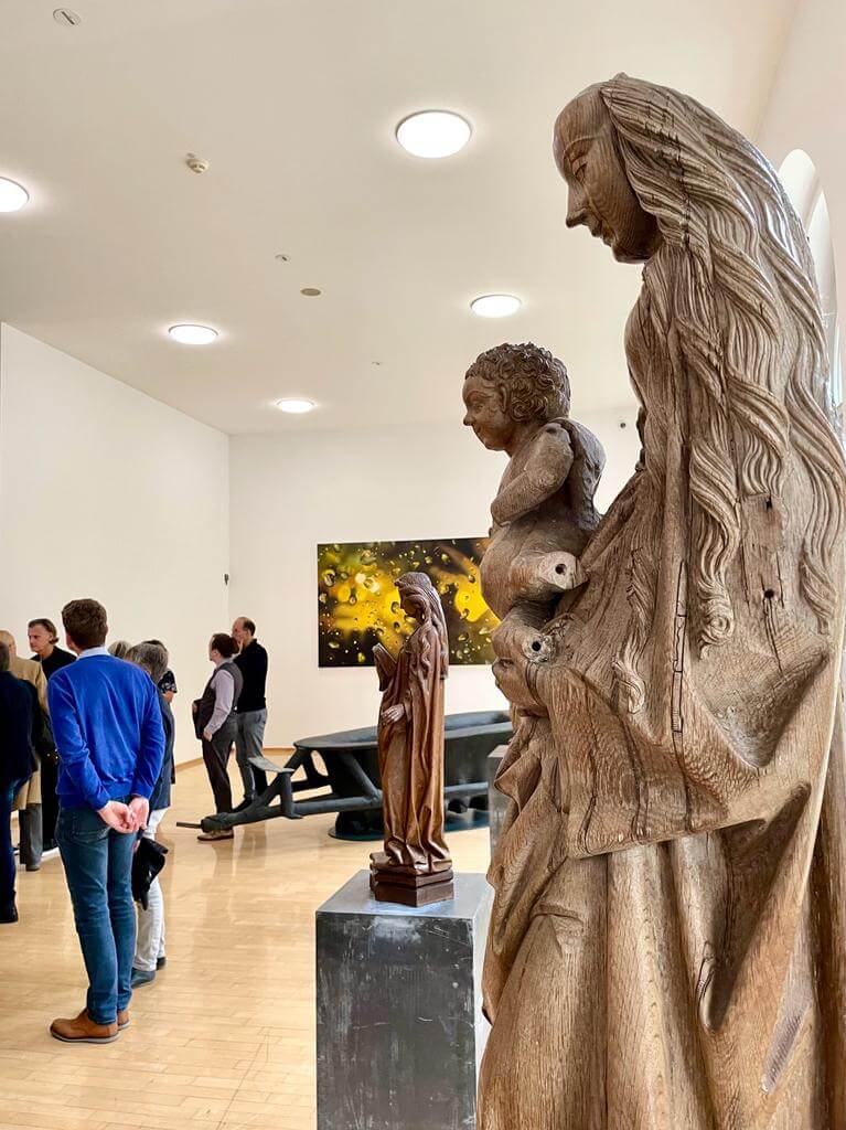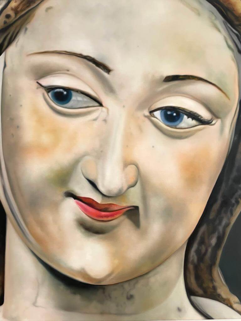 Im Museum Kurhaus Kleve und im Museum Franz Gertsch präsentiert Karin Kneffel eine neue, in Museen bislang noch nicht gezeigte Werkserie, die sie während der durch das Coronavirus bedingten Isolation der vergangenen Jahre geschaffen hat. Bis auf wenige Ausnahmen macht Karin Kneffel erstmals überhaupt das Menschenbild zum Thema dieser neuen Serie. Sie malt mittelalterliche Madonnenstatuen des 14. bis 16. Jahrhunderts mit einer besonderen farbigen Fassung, die sie vornehmlich im süd- als auch norddeutschen Raum gefunden hat. (Kuratorin Valentina Vlašić)