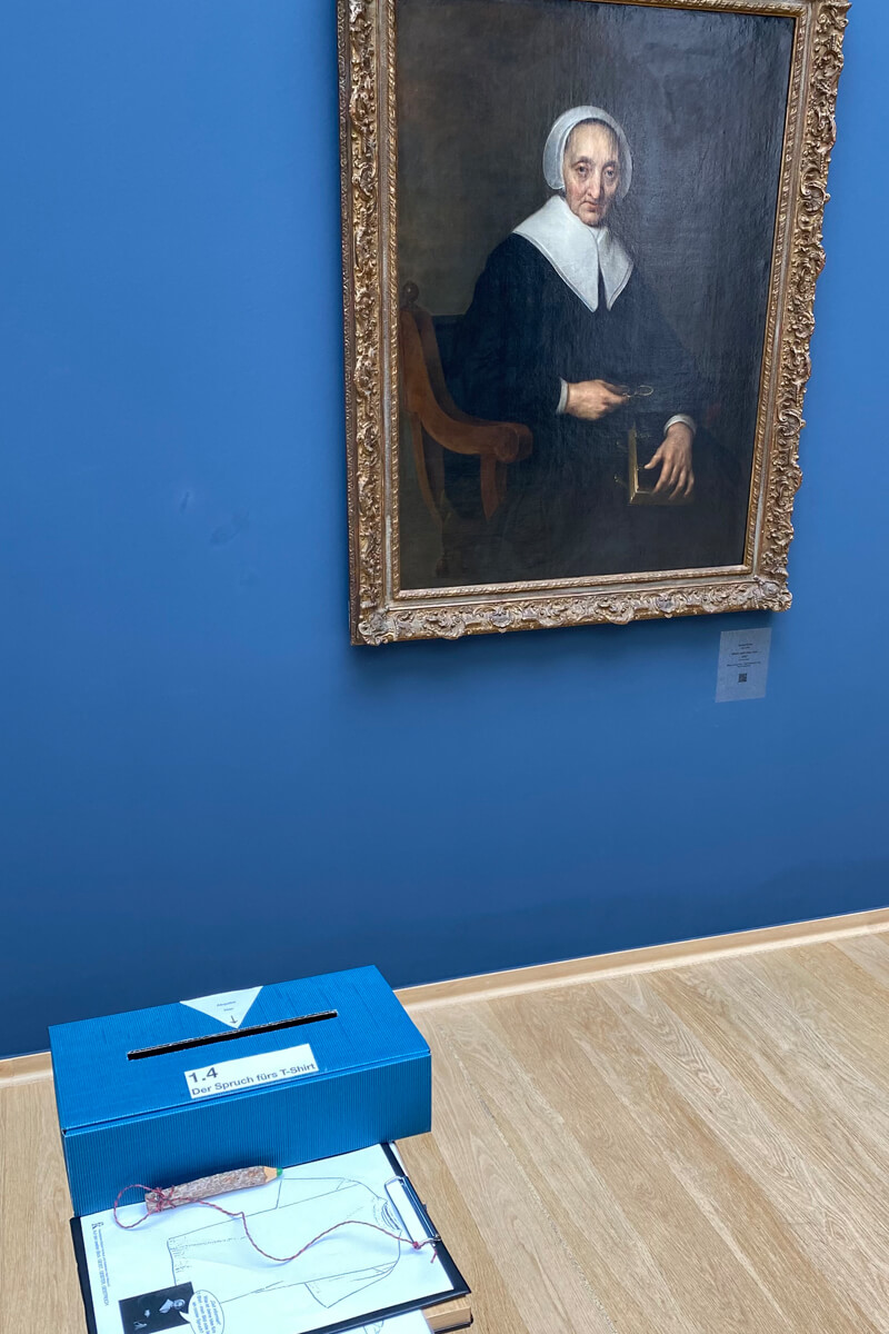 Das Porträt dieser alten Frau ist mit dem Datum 1657 signiert. Es zeigt sie - vielleicht auf Wunsch der Auftraggeberin - im Stil der Mode um 1640, der zur Entstehungszeit des Bildes nicht mehr up to date war. In der Hand hält die Frau eine Brille. Sie kann offensichtlich lesen.