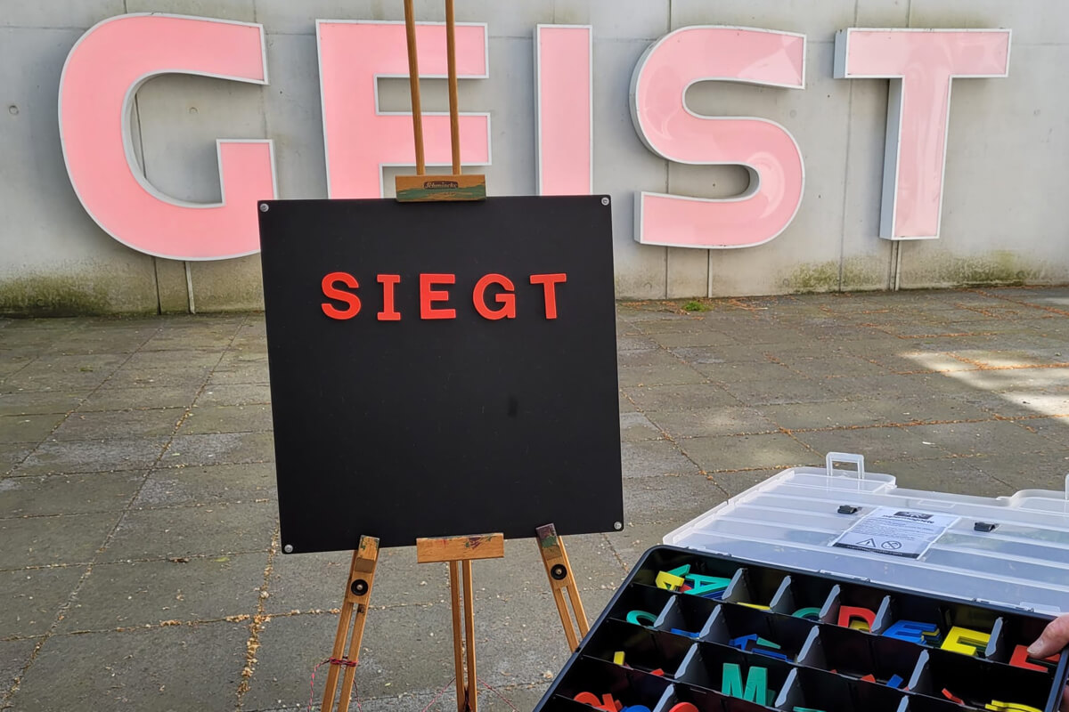 Die mannshohen Buchstaben des Wortes GEIST haben eine besondere Geschichte. Ursprünglich gehörten sie zu einem leuchtenden Schriftzug, der oben an einer 14-geschossigen Hochhauswand in Dresden seit 1969 in die Stadt strahlte. Kurz vor dem Ende der DDR ließ der Dresdener Bürgermeister 1987 diesen Propaganda-Spruch Der Sozialismus siegt abbauen. Aus dem Wort SIEGT gestaltete der Dresdener Künstler Via Lewandowsky GEIST.