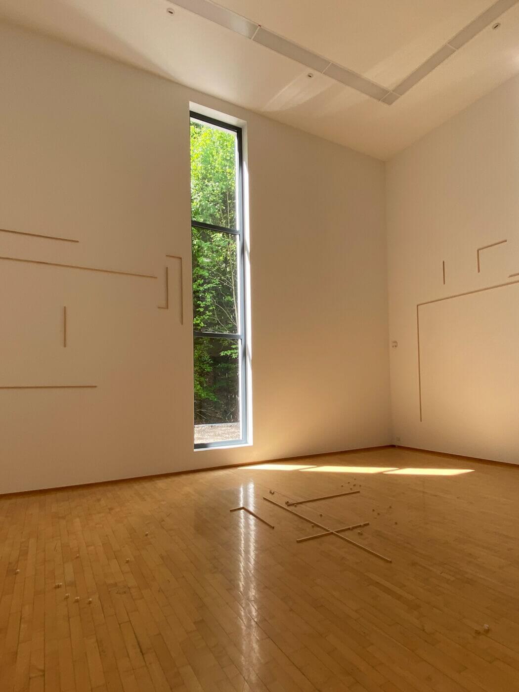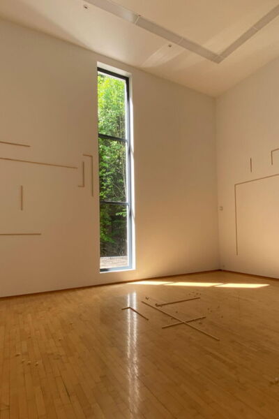 - Zum bewaldeten Berghang wurde die Säulengalerie mit großer Fensterfront ergänzt, die Natur so ins Museum einbezogen.