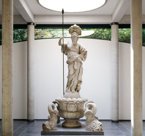 Der Typograf und Entwerfer Walter Nikkels hat im Museum für diese „Pallas Athene“, die Göttin der Künste, die Johann Moritz als Geschenk erhielt, einen besonderen Platz gestaltet: Über ihr läßt ein Glasfenster den Blick zum Himmel frei; hinter ihr verläuft eine bogenförmige Wand, bogenförmig rund wie der Horizont.