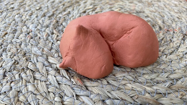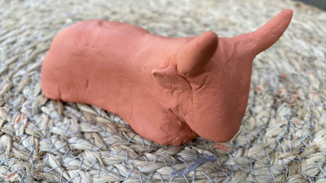 Gestalte aus dem plastischen Material ein kleines liegendes Kälbchen oder eine kleine liegende Kuh.