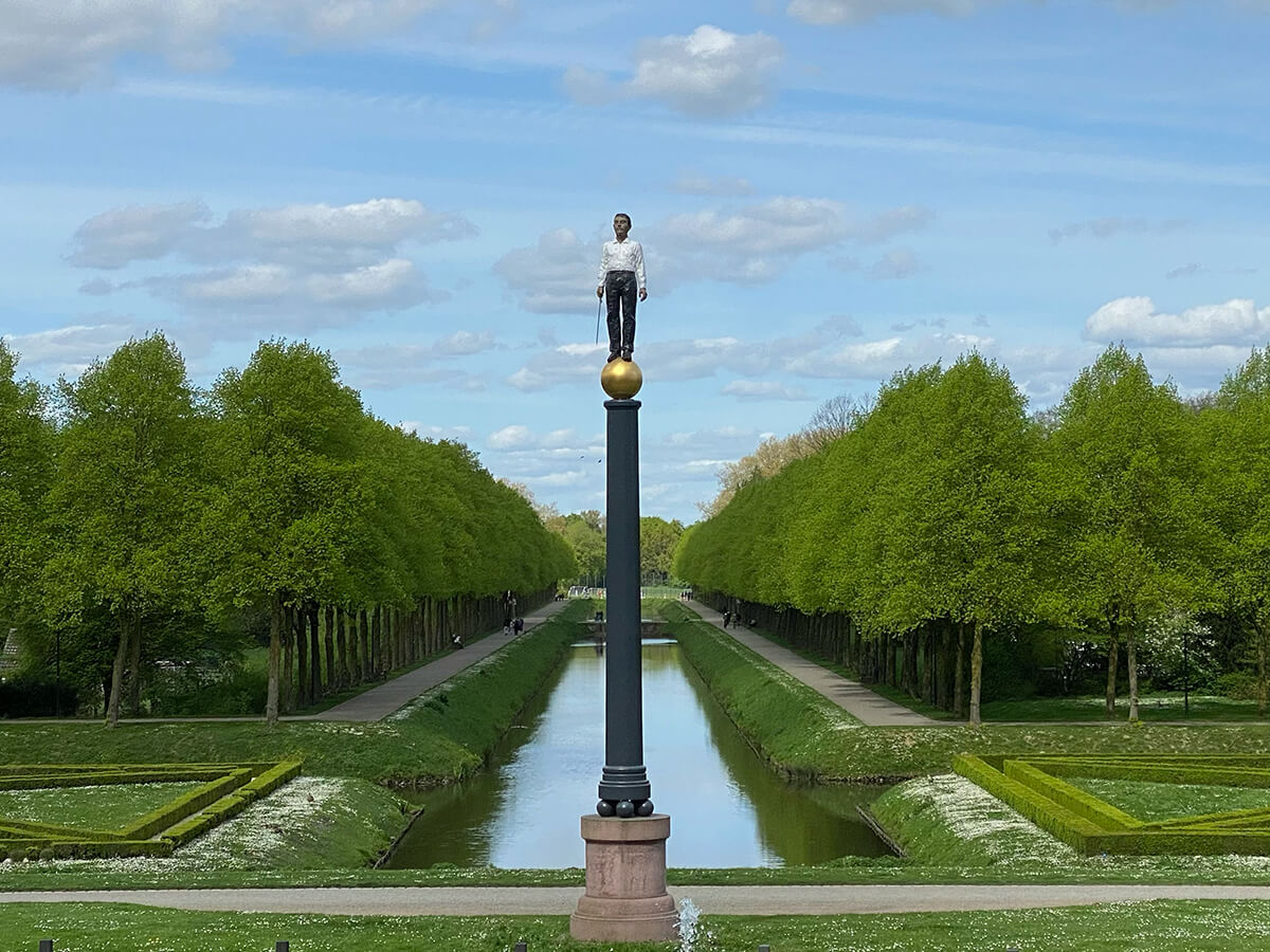 Der Neue Eiserne Mann steht an der Stelle, an der Johann Moritz 1653 nach den Wirren des Dreißigjährigen Krieges ein Siegeszeichen (Tropaion) errichtete, om voor een teycken van den soeten vreed te groeten (Maria van Akerlaeken, 1653).