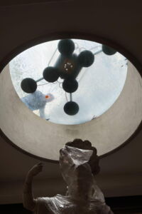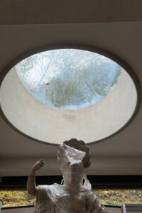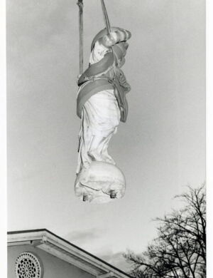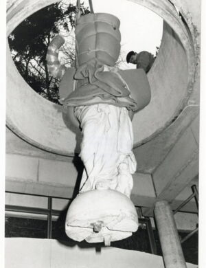 Pallas Athene kehrte im Dezember 1994 nicht mehr in den Garten des Museums Haus Koekkoek zurück, sondern schwebte "vom Himmel" durch ein rundes Dachfenster in die Säulenhalle des Museums Kurhaus, das 1994 noch eine große Baustelle war.