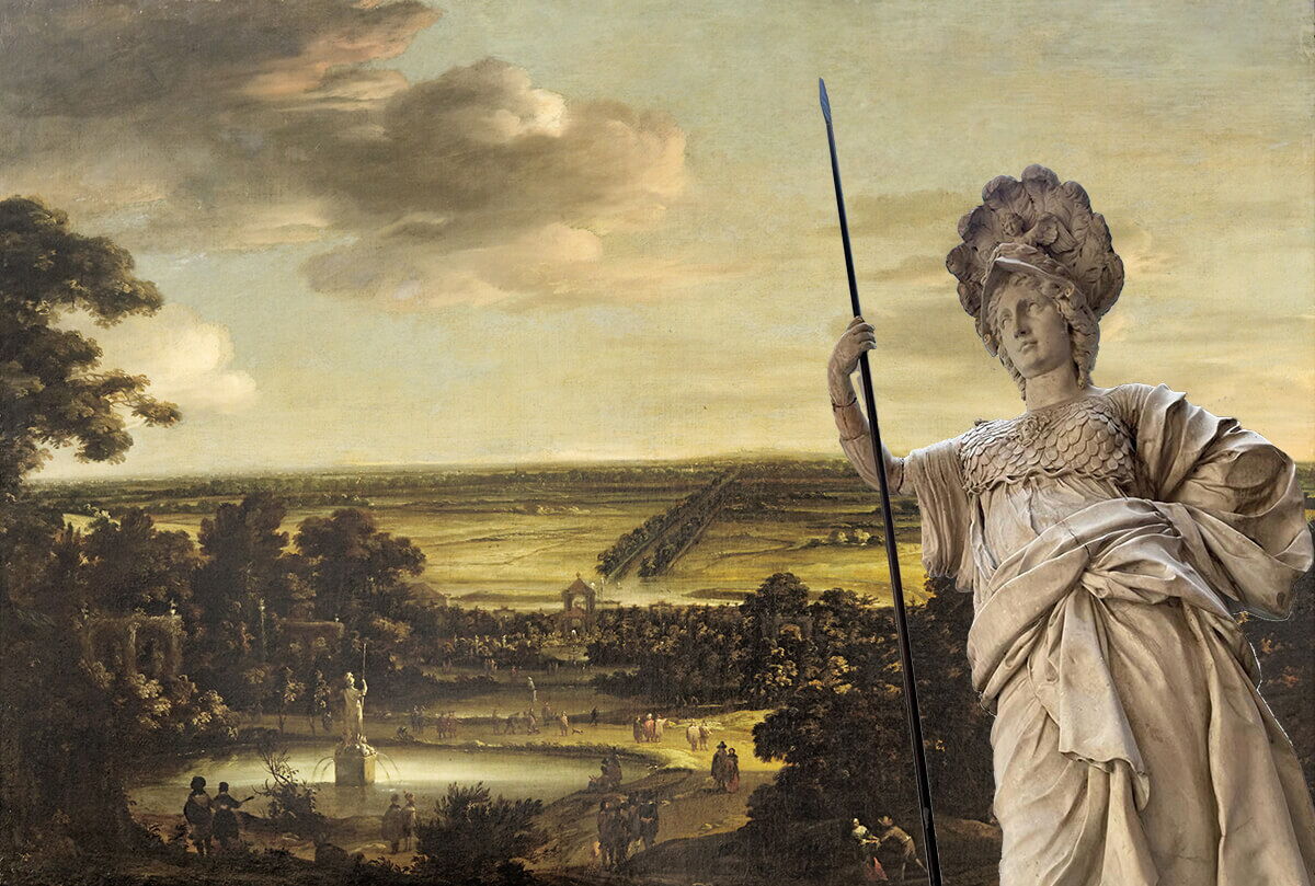 Im Bild Rast im Schutze der Klever Minerva (1665) setzt Abraham Jansz. Begehyn die Skulptur der Göttin in eine Fantasielandschaft
