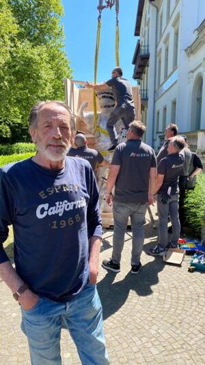 Als am 12.05.2025 die Skulptur der Pallas Athene aus dem Museum Kurhaus Kleve abgeholt wurde, kam Norbert van Elten als Zuschauer vorbei.