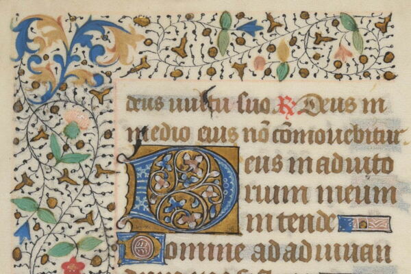 Blatt aus einem Stundenbuch mit Gebetstext und Ornamentbordüre mit Ranken aus Blumen und Brombeeren, französisch 15. Jh. / MKK Dauerleihgabe des Freundeskreises Museum Kurhaus u. Koekkoek-Haus Kleve; Nachlass Rose und Gustav Wörner, Wuppertal; >> Digitale Sammlung MKK