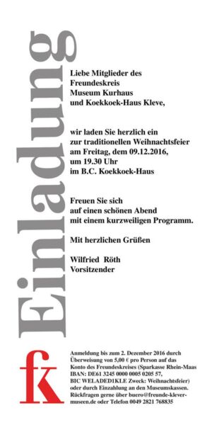 Die Mitglieder des Freundeskreises trafen sich zur traditionellen Weihnachtsfeier, die - wegen der Umbauarbeiten im B.C. Koekkoek-Haus - erstmals im Museum Kurhaus stattfand. Kunsthistorische Einblicke und Musikgenuss an verschiedenen Orten im Museum bildeten den Auftakt, dem geselliges Miteinander in der Lounge und in der Wunderkammer folgten.