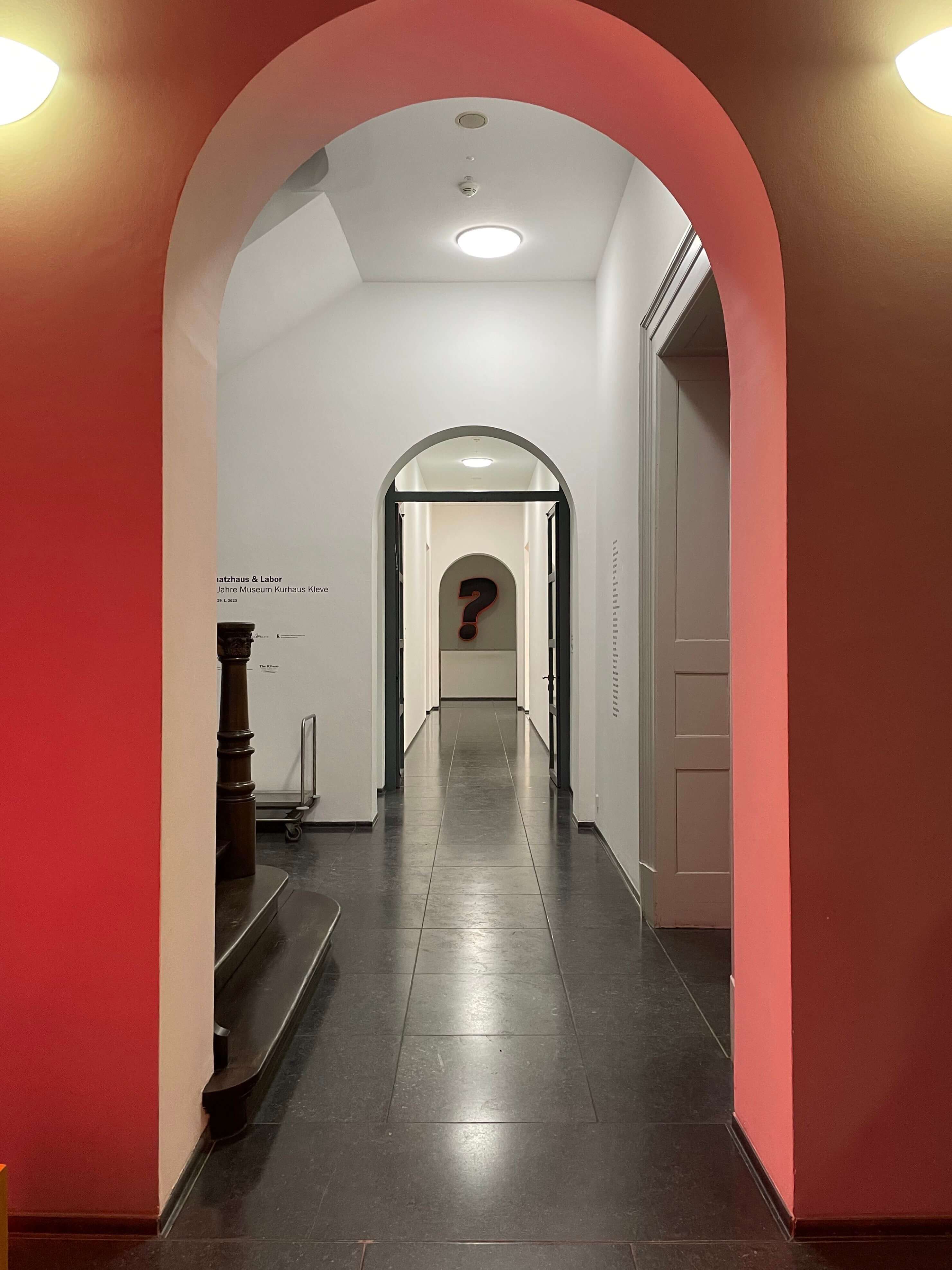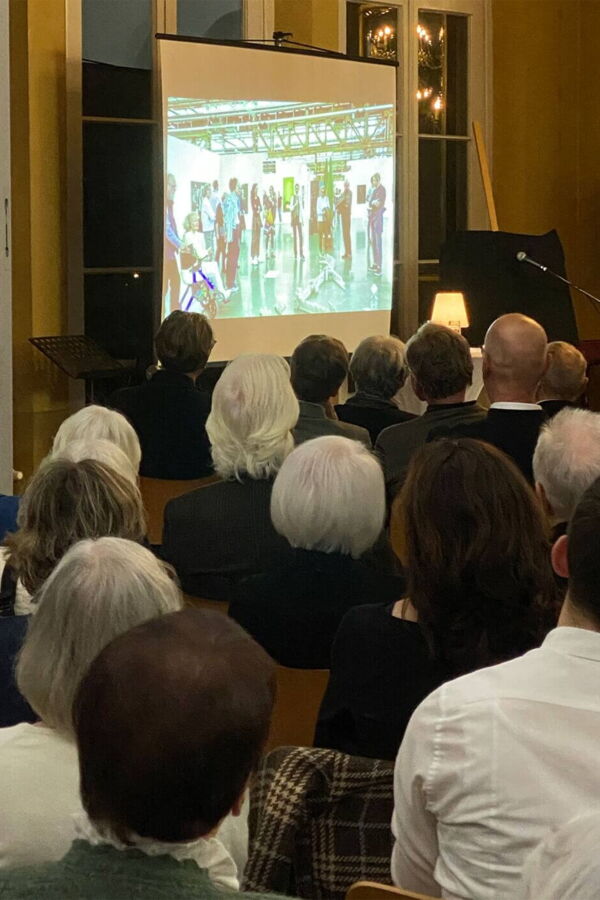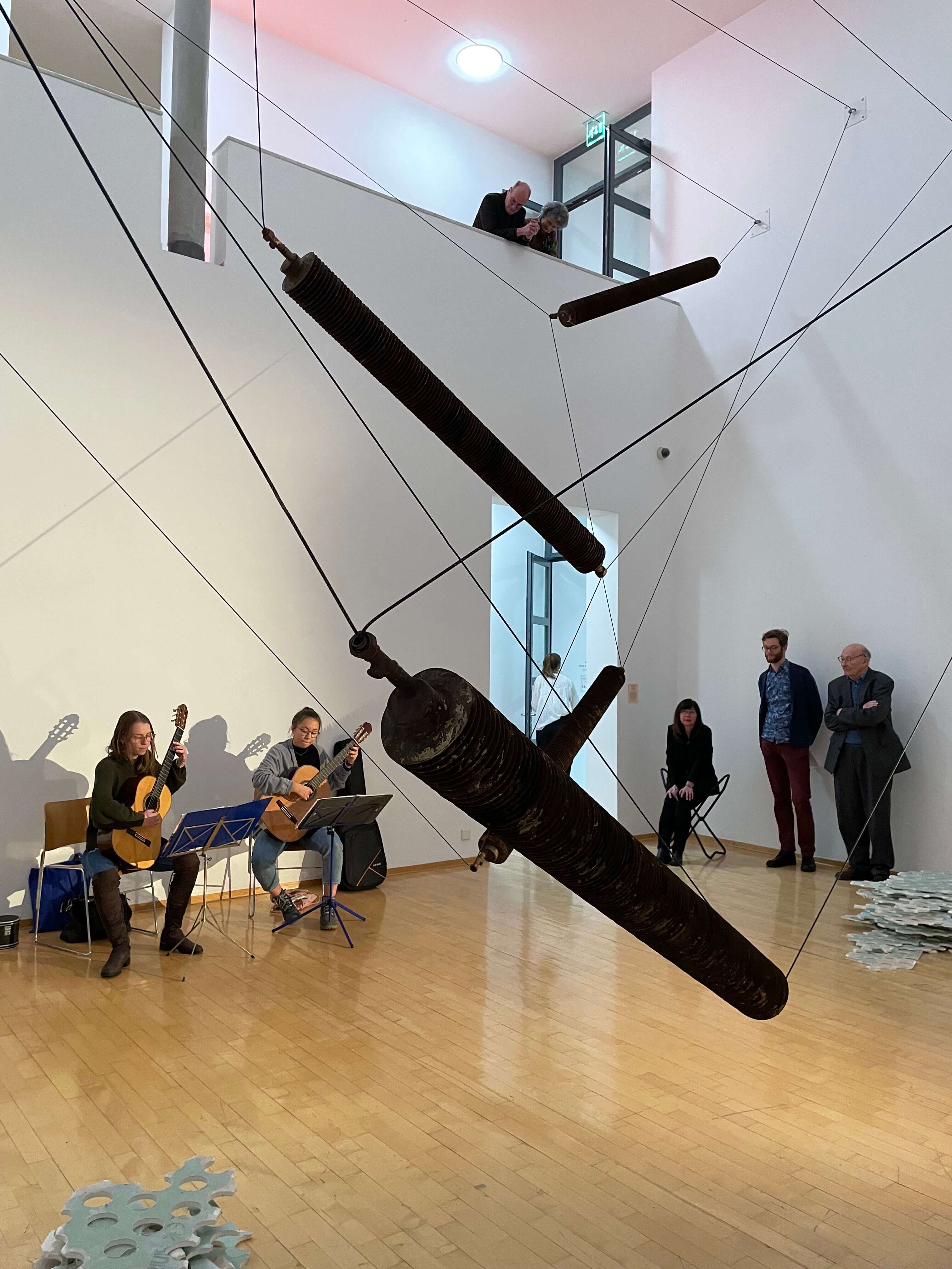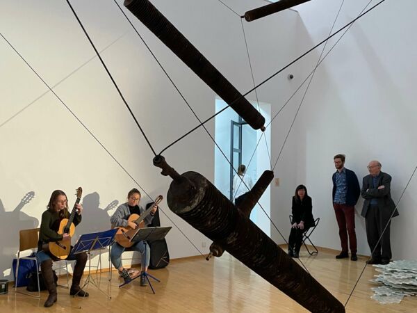 Im zweigeschossigen Saal eröffneten Lea Kasten und Helen Heusipp, Schülerinnen der Musikschulen des Kreises Kleve e.V. aus der Klasse von Margot Dellmann-Storm, mit Gitarrenklängen. Anschließend gab Harald Kunde kunsthistorische Einblicke zur Rauminstallation Vermutung 722 von Franka Hörnschemeyer (zur Ausstellung: Schatzhaus und Labor - 25 Jahre Museum Kurhaus Kleve)