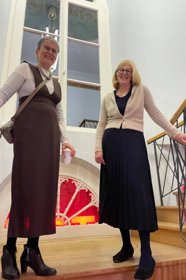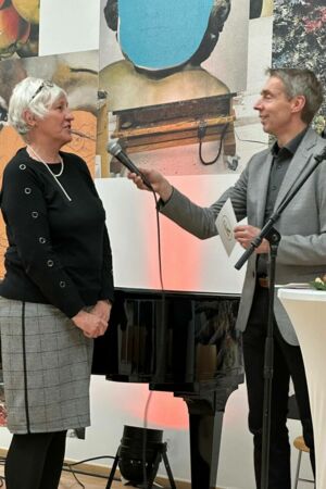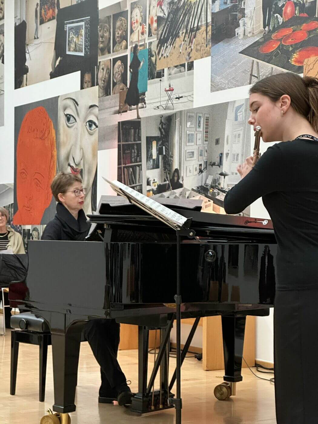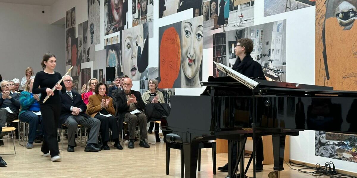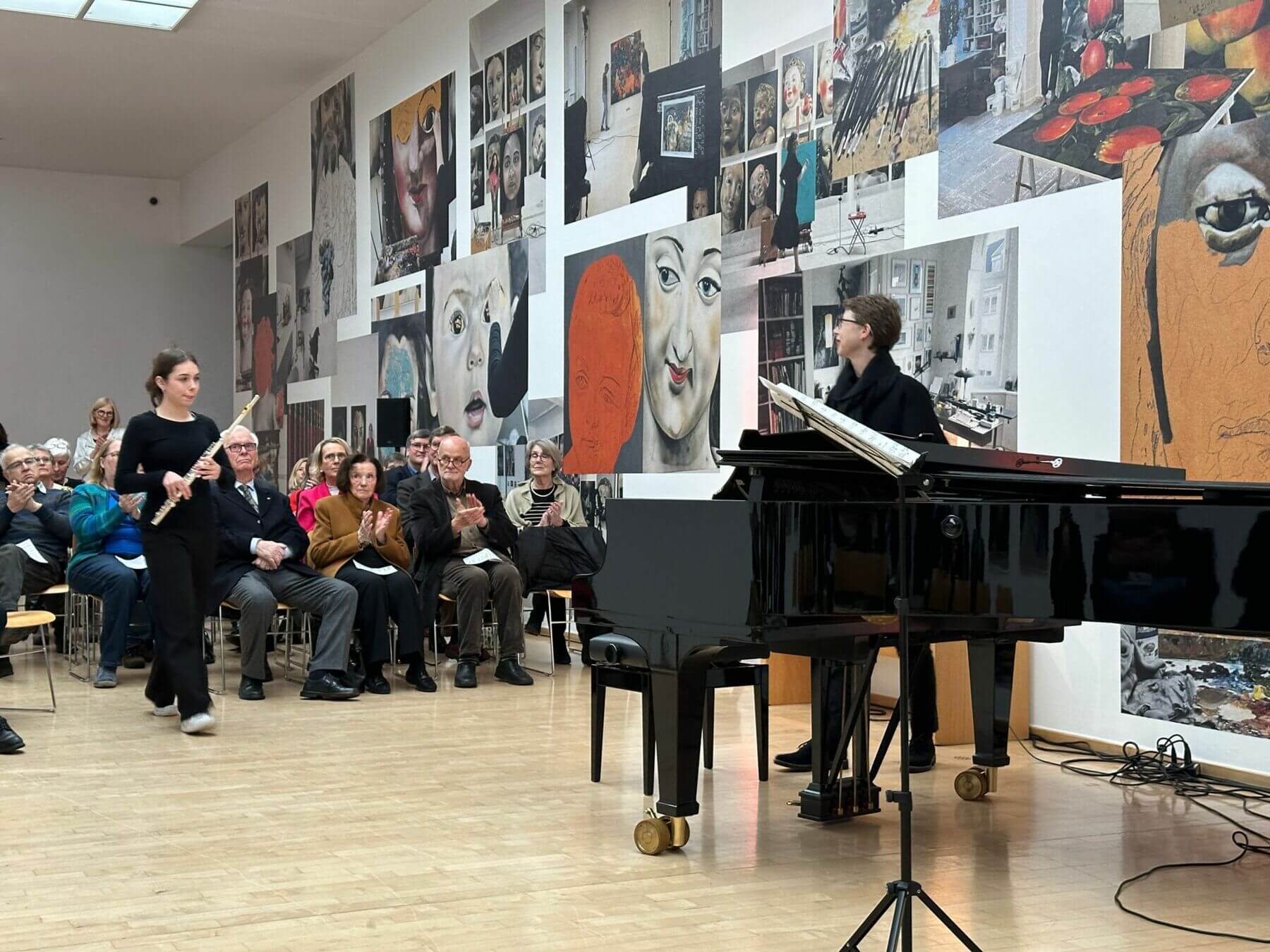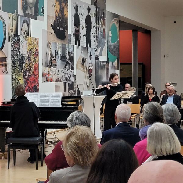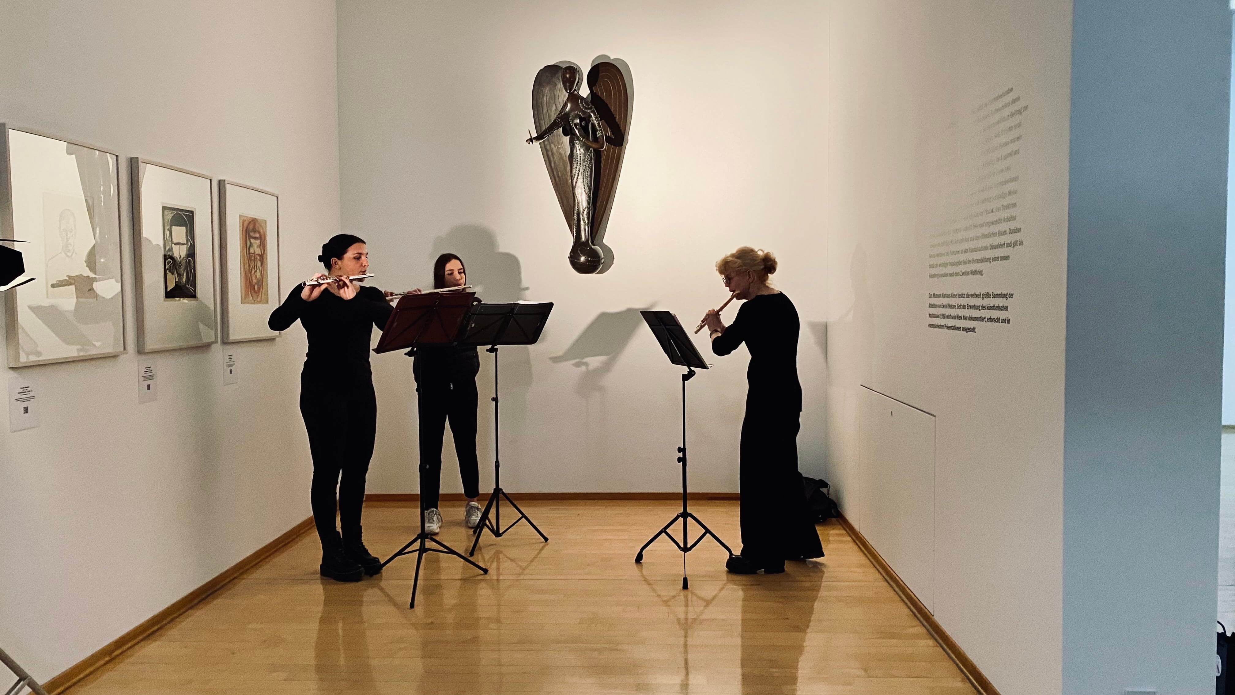 Unter dem Engel von Ewald Mataré erklangen Instrumentalstücke für drei Querflöten, vorgetragen von Lena Rütten und Hanna Wolf, Schülerinnen der Musikschulen des Kreises Kleve aus der Klasse von Frigge Wiederhold-Walter. In Vertretung von von Ursula Geisselbrecht-Capecki wurden im Anschluss die Neuerwerbungen des letzten Jahres für das B.C. Koekkoek-Haus durch Jutta Tönnissen vorgestellt.