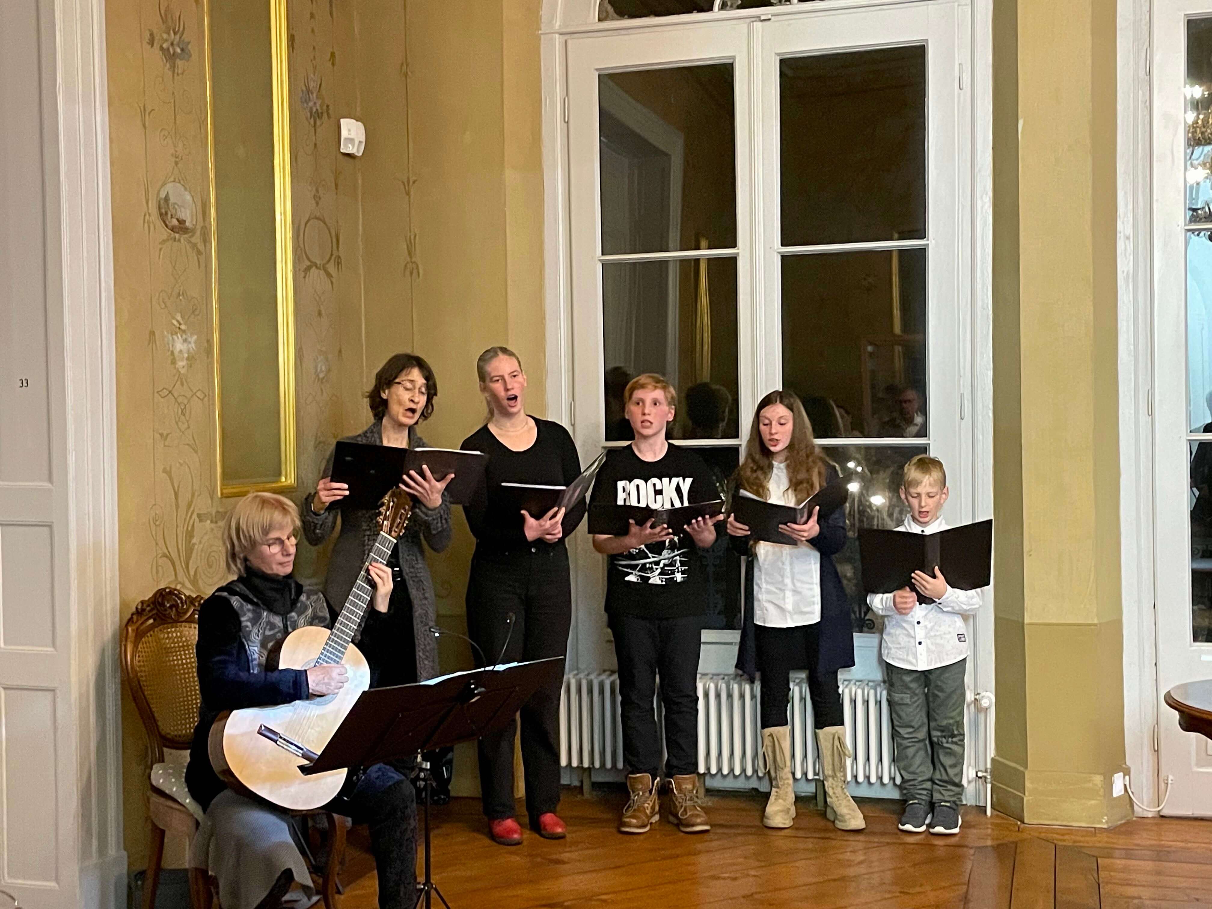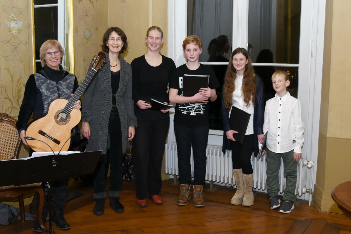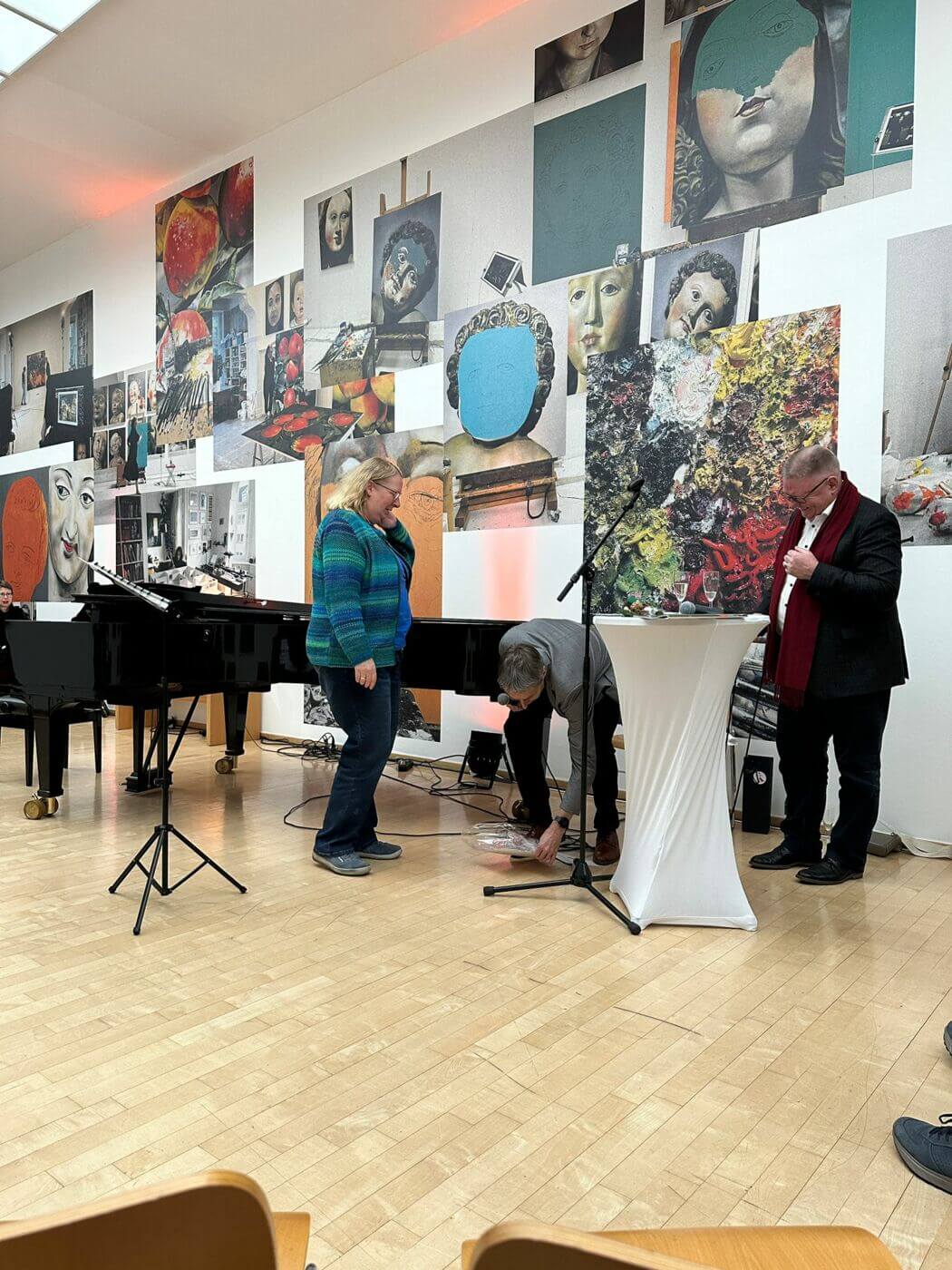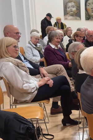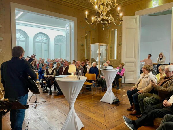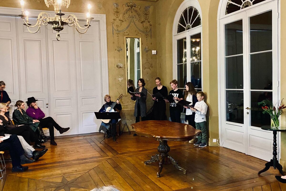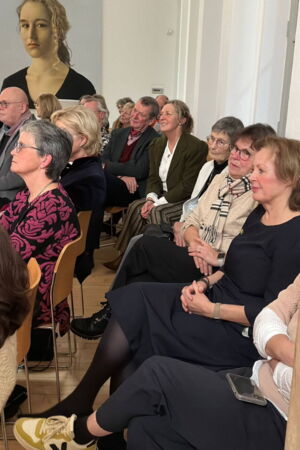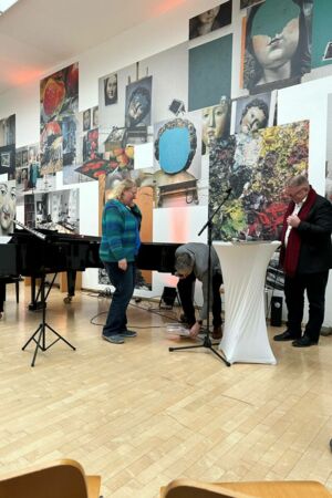 Das Hochzeitszimmer im Friedrich-Wilhelm-Bad bot den stimmungsvollen Rahmen für das Gesang Ensemble der Musikschulen des Kreises Kleve unter Leitung von Franziska Dieckmann mit Jurij Roganskij, Yeva Shyrobokova, Yelisei Shyrobokov und Emely Minervini, an der Gitarre begleitet von Margot Dellmann-Storm. Danach gab Valentina Vlašić Einblicke in die künstlerischen Gedanken, die Studierende der Kunstakademie München (Klasse Pia Fries) bei einem Projekt im Museum Kurhaus entwickelt haben (Zur Ausstellung: Zwischen Gestern und Morgen, Klasse Pia Fries).