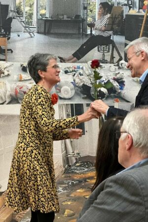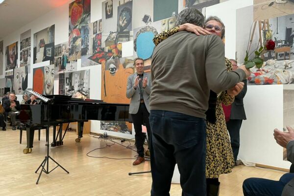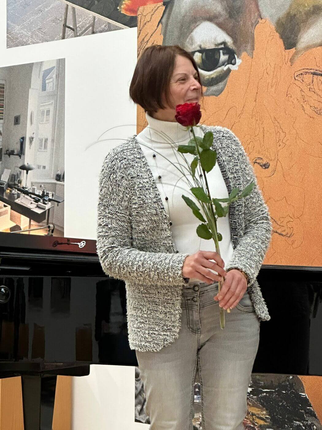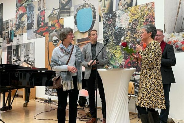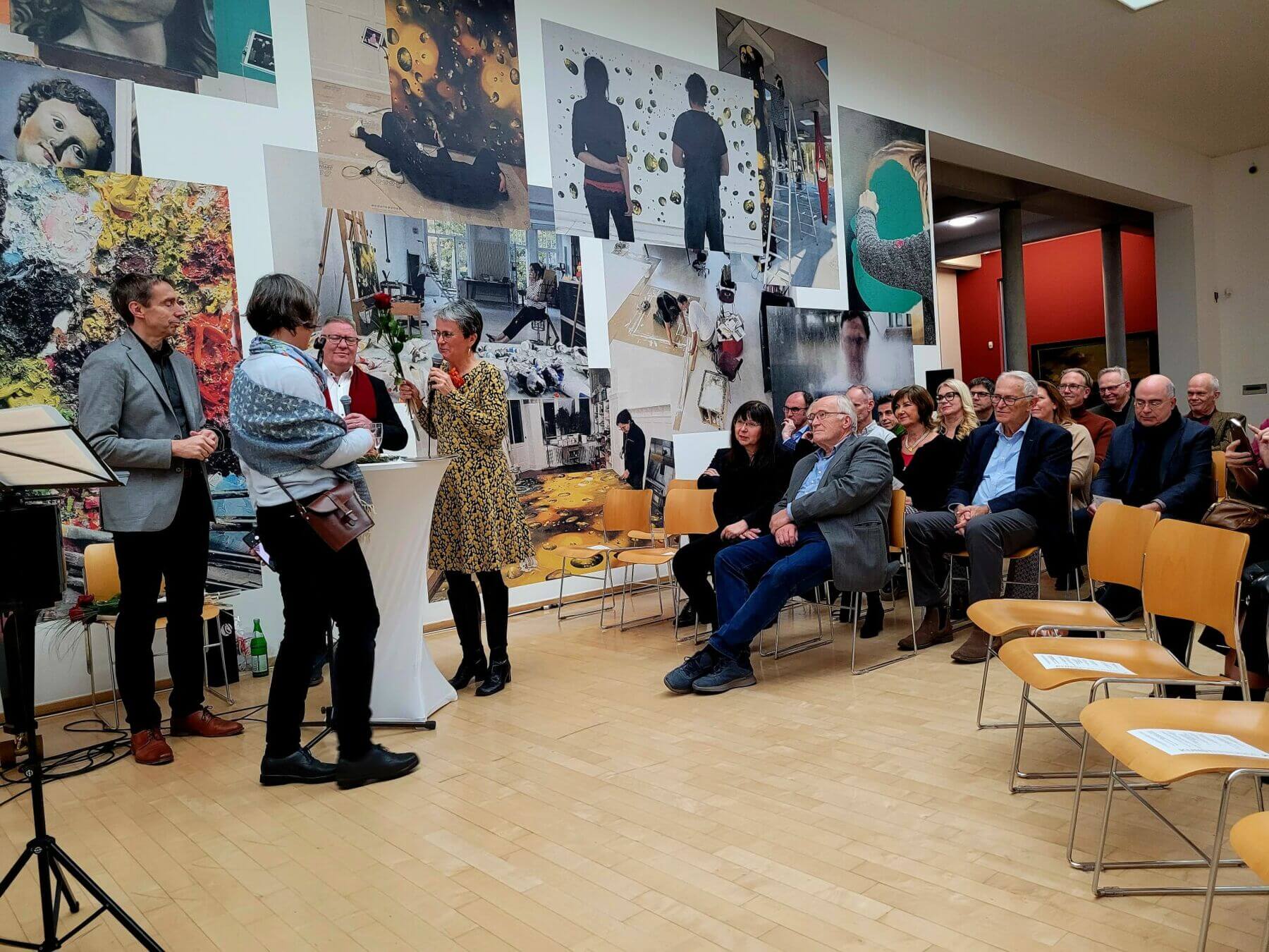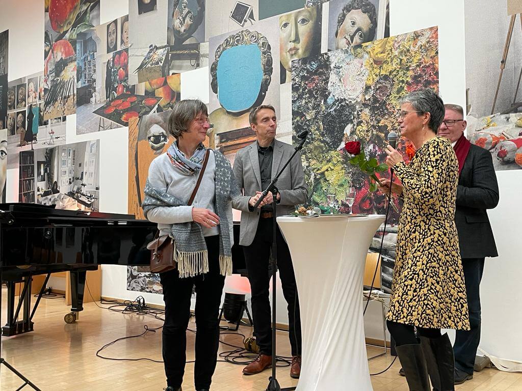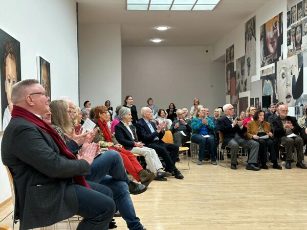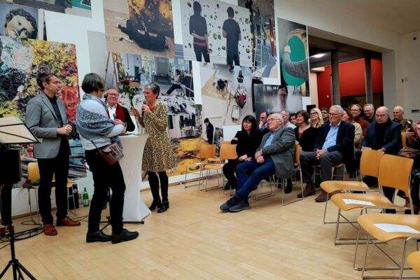 Das Hochzeitszimmer im Friedrich-Wilhelm-Bad bot den stimmungsvollen Rahmen für das Gesang Ensemble der Musikschulen des Kreises Kleve unter Leitung von Franziska Dieckmann mit Jurij Roganskij, Yeva Shyrobokova, Yelisei Shyrobokov und Emely Minervini, an der Gitarre begleitet von Margot Dellmann-Storm. Danach gab Valentina Vlašić Einblicke in die künstlerischen Gedanken, die Studierende der Kunstakademie München (Klasse Pia Fries) bei einem Projekt im Museum Kurhaus entwickelt haben (Zur Ausstellung: Zwischen Gestern und Morgen, Klasse Pia Fries).