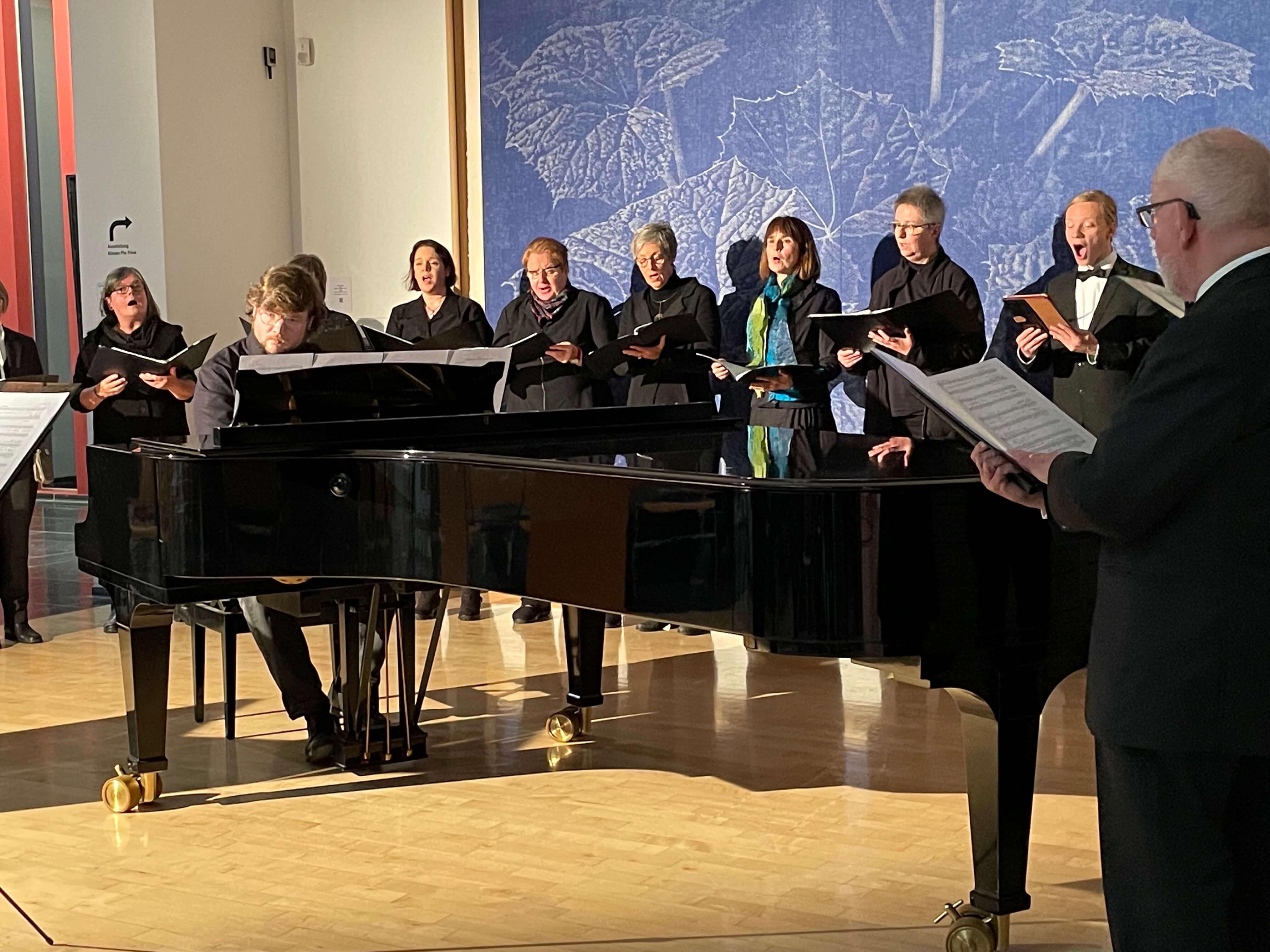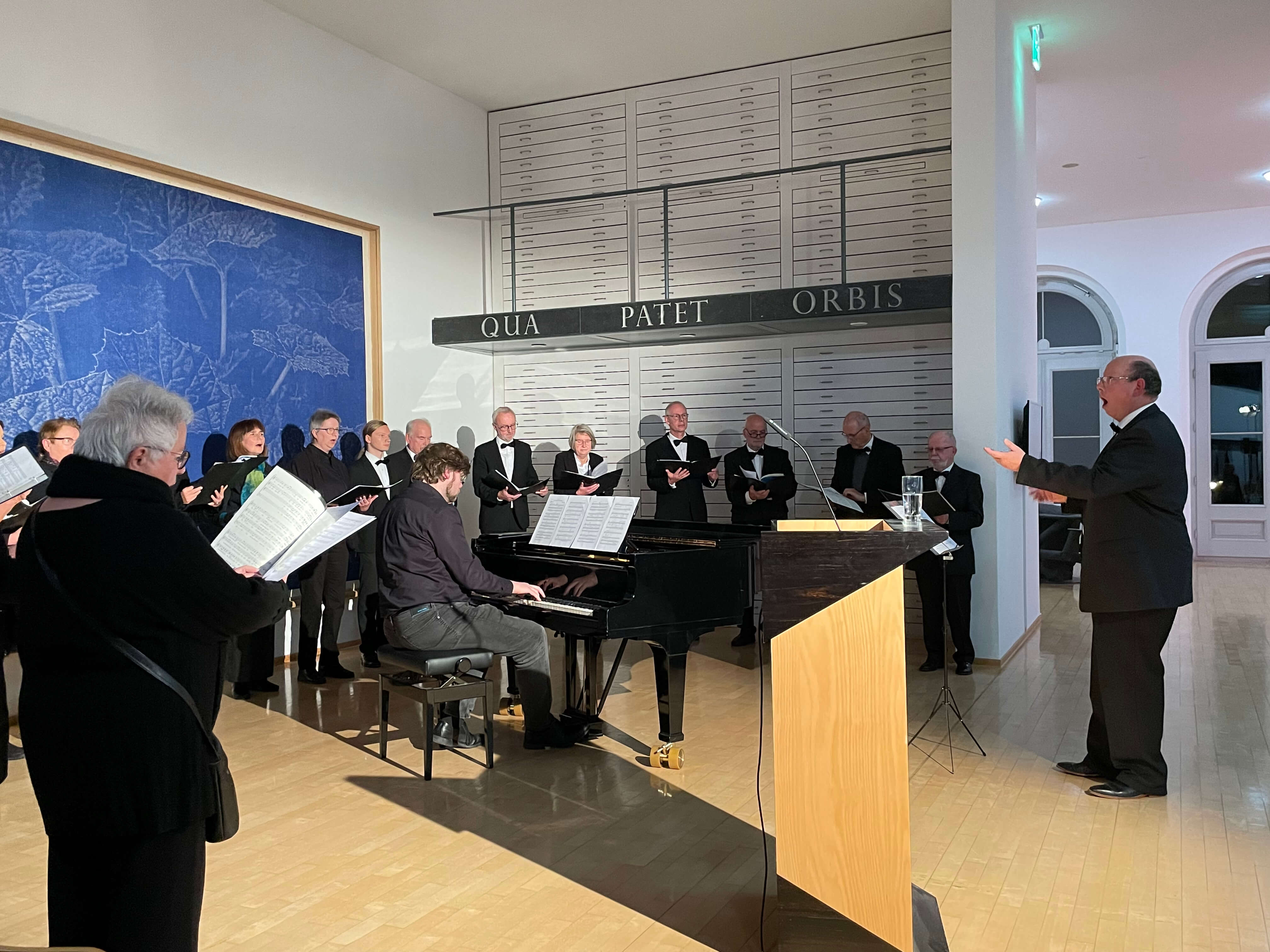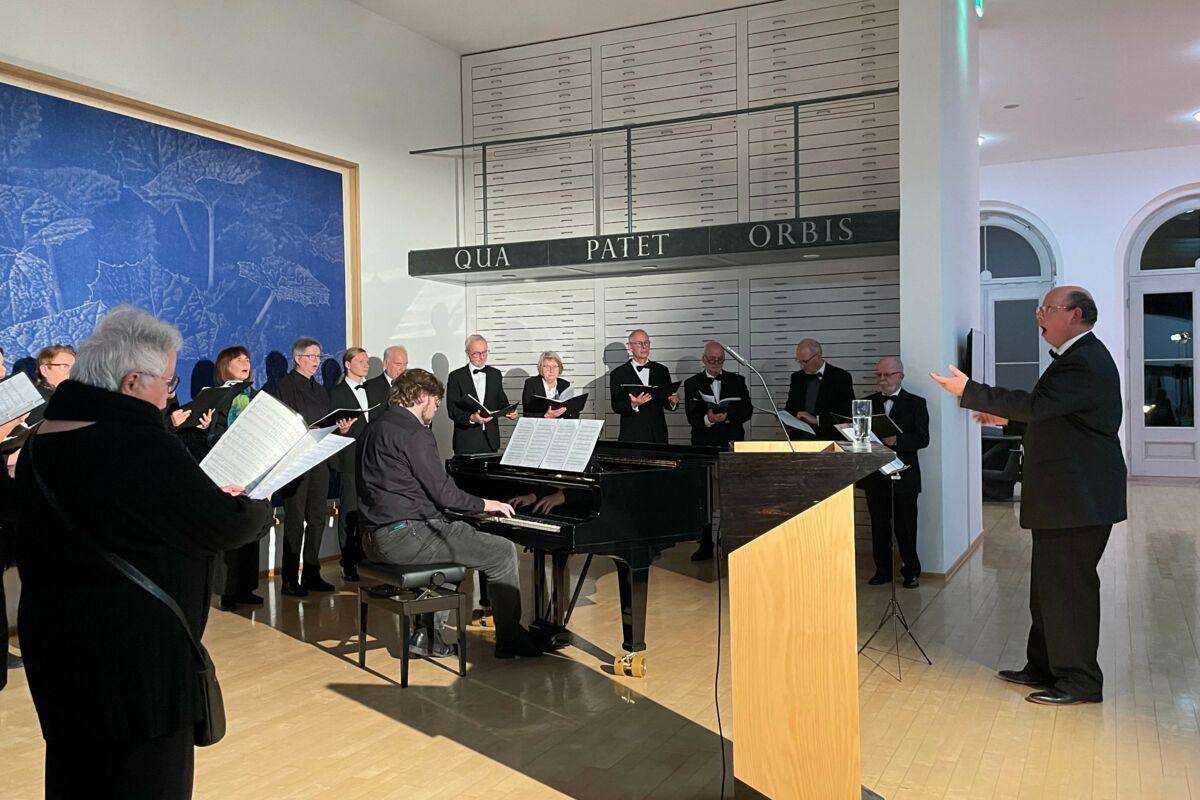 In der Pinakothek begrüßten Wilfried Röth und Harald Kunde die Mitglieder des Freudeskreises, musikalisch eingestimmt in die vorweihnachtliche Zeit durch den Raum füllenden Chorgesang.