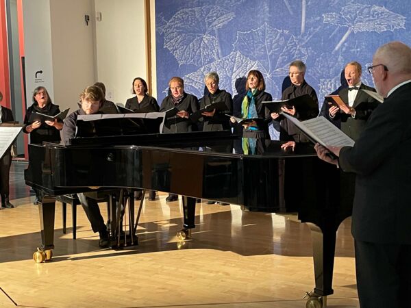 Der Chor aus Mitgliedern der Städtischen Singgemeinde Kleve sang unter Leitung von Stefan Burs Ausschnitte aus dem Konzert Et in Terra Pax, das am 11.12.2022 in Emmerich aufgeführt wurde: Das alte Adventslied Maria durch ein Dornwald ging, ein englisches Winterlied In the bleak midwinter und das ukrainische Lied Schtschedryk. Am Flügel begleitete Philipp Hövelmann.