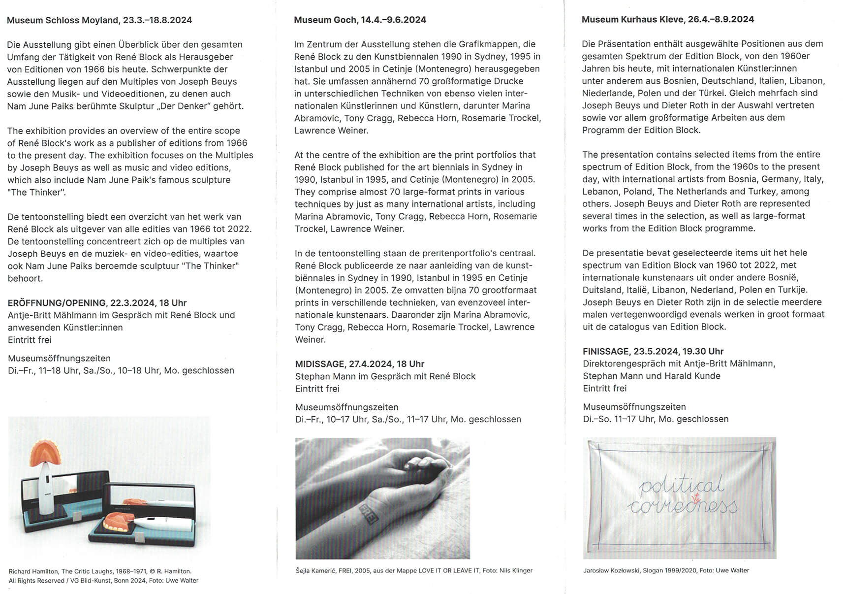 Die aktuelle Ausstellung würdigt René Block (*1942), der in Goch das Gymnasium besucht hat, für sein umfassendes und bis heute andauerndes Engagement für die internationale zeitgenössische Kunst sowie insbesondere für Joseph Beuys und ist eine Kooperation der drei Kunstmuseen Museum Schloss Moyland, Museum Kurhaus Kleve und Museum Goch.(aus dem Info-Flyer der drei Museen)