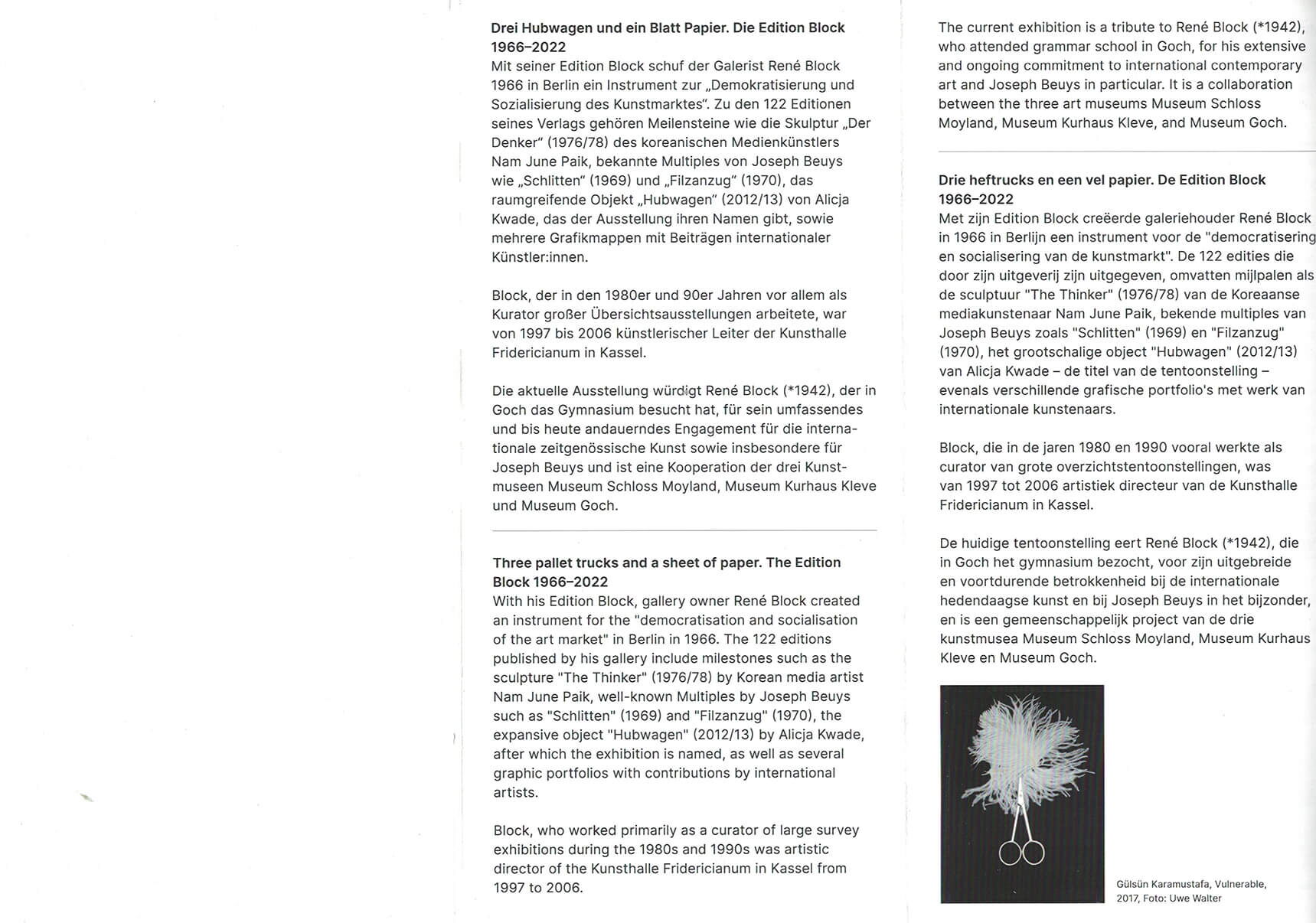 Mit seiner Edition Block schuf der Galerist René Block 1966 in Berlin ein Instrument zur „Demokratisierung und Sozialisierung des Kunstmarktes". Zu den 122 Editionen seines Verlags gehören Meilensteine wie die Skulptur „Der Denker" (1976/78) des koreanischen Medienkünstlers Nam June Paik, bekannte Multiples von Joseph Beuys wie „Schlitten" (1969) und „Filzanzug" (1970), das raumgreifende Objekt „Hubwagen" (2012/13) von Alicja Kwade, das der Ausstellung ihren Namen gibt, sowie mehrere Grafikmappen mit Beiträgen internationaler Künstler:innen.