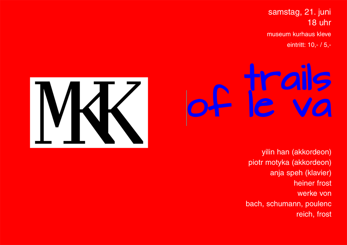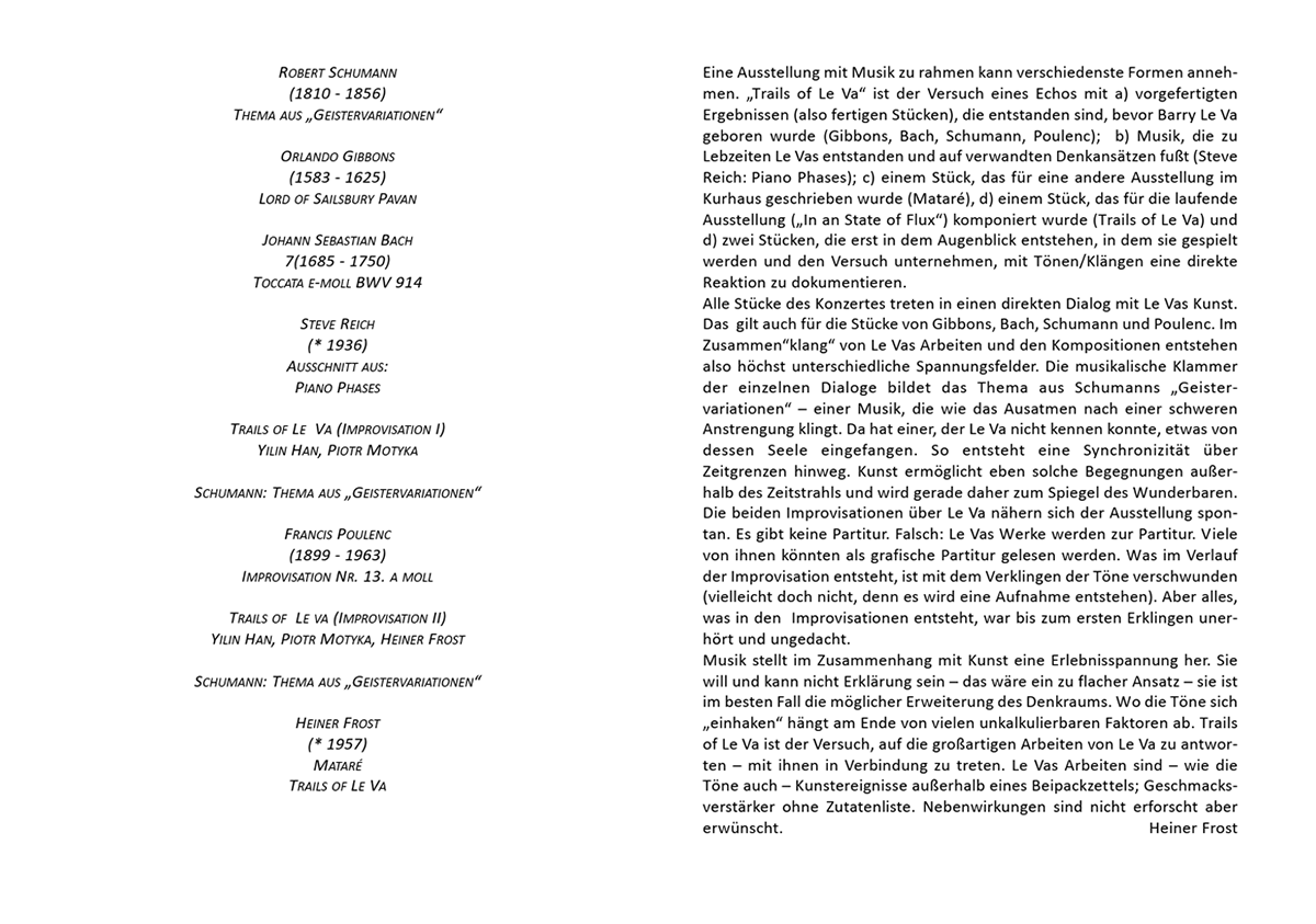 Nach dem wunderbaren Wandelkonzert mit den mehrfach ausgezeichneten Akkordeonisten Yilin Han und Piotr Motyka im November 2024 im Kosmos Mataré gibt es am 21.06.2025 um 18 Uhr eine Fortsetzung. In verschiedenen Sälen der Ausstellung "Barry Le Va" werden sie und Anja Speh (Flügel) sowie Heiner Frost (Flügel) ein ganzheitliches Erlebnis aus Klang und Kunst präsentieren.