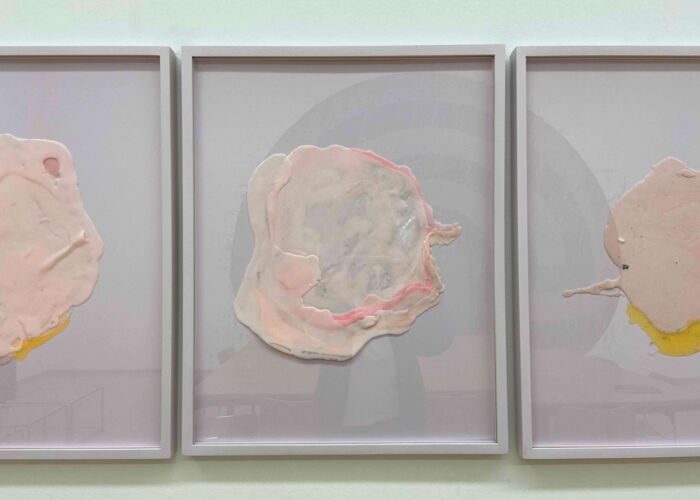 Die Werke bestehen aus Silikonflecken, welche die Künstlerin in Schichten auf den Boden gegossen hat. Durchsetzt von Glitzer, Staub und anderen Überresten zeugen Sie von den Mythen und Realitäten eines Künstlerateliers. Immer wieder thematisiert Dieckwisch die Malerei, macht dies aber anhand von skulpturalen Mitteln und mit Materialien wie Silikon, Keramik, Textil und Fotografie (SF).