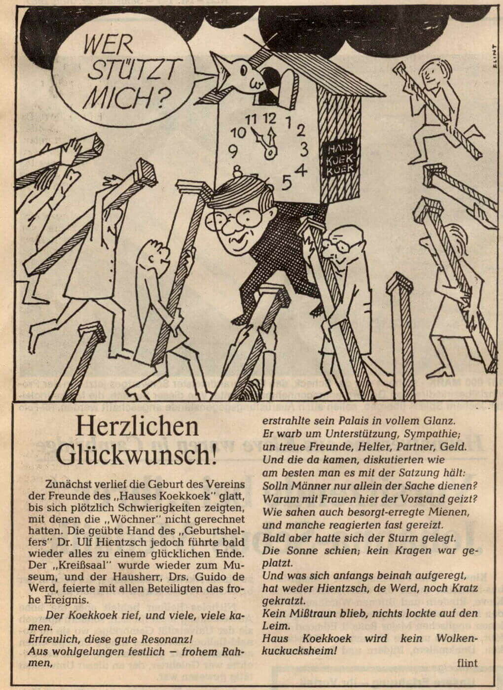 Abbildung: Karikatur von W. Flinterhoff zur Gründung des Freundeskreis Klever Museen im Städtischen Museum Haus Koekkoek (Rheinische Post 27.06.1987)
