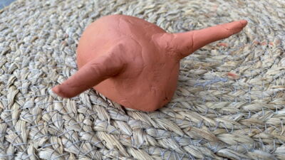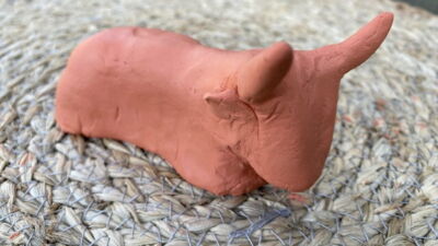 Gestalte aus dem plastischen Material ein kleines liegendes Kälbchen oder eine kleine liegende Kuh.