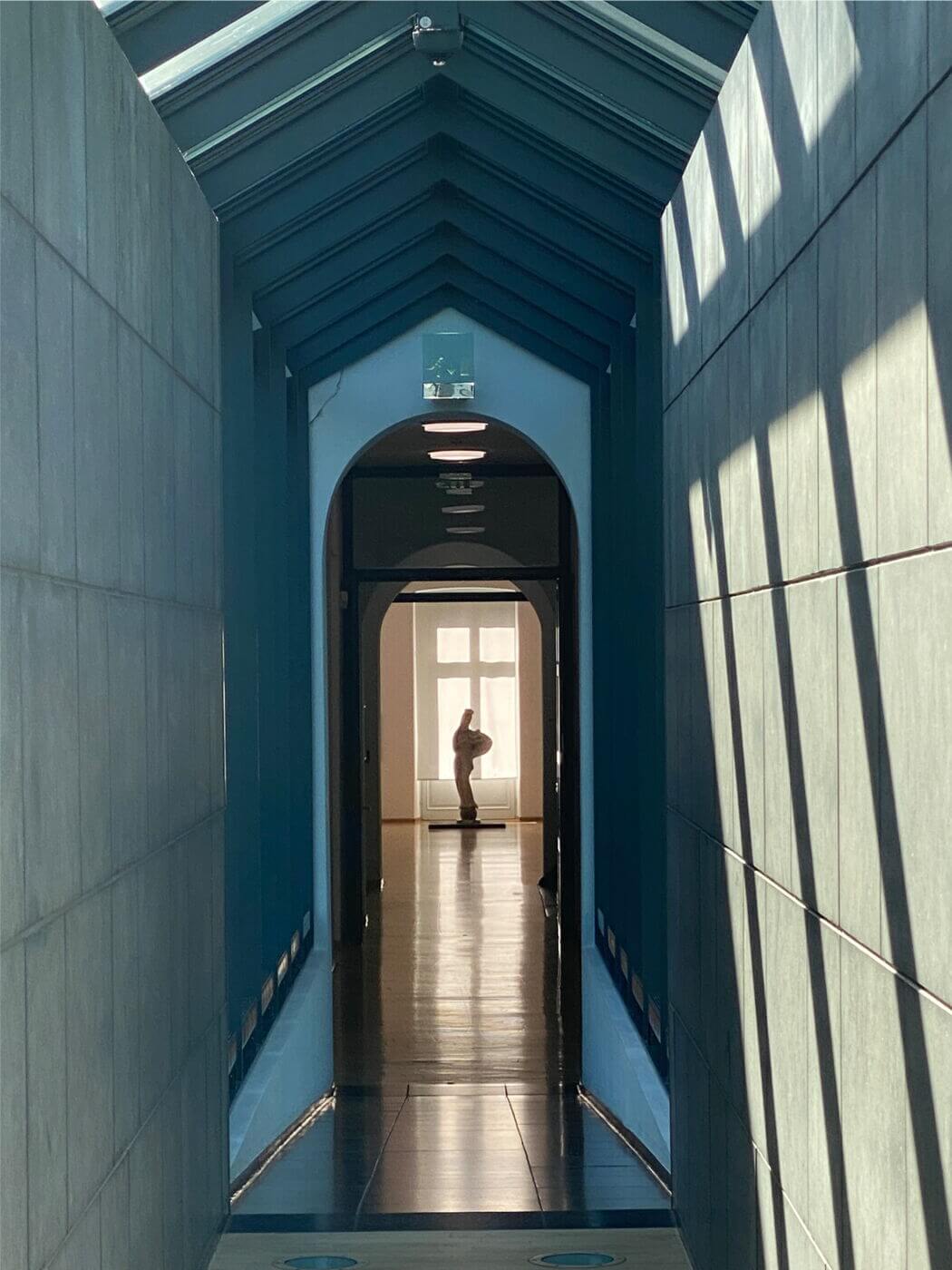 Der Typograf und Entwerfer Walter Nikkels hat im Museum für diese „Pallas Athene“, die Göttin der Künste, die Johann Moritz als Geschenk erhielt, einen besonderen Platz gestaltet: Über ihr läßt ein Glasfenster den Blick zum Himmel frei; hinter ihr verläuft eine bogenförmige Wand, bogenförmig rund wie der Horizont.