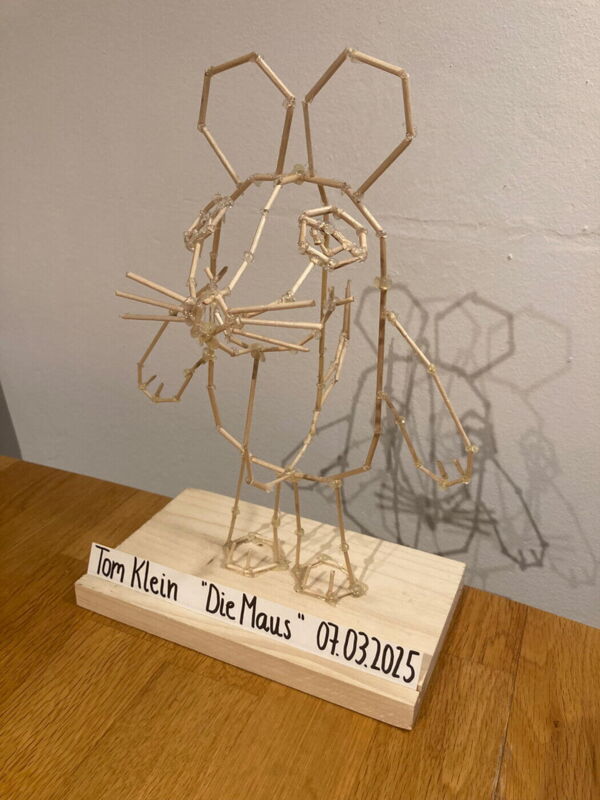 Der Künstler Janusz Grünspek lässt uns noch einmal miterleben, wie man eine dreidimensionale Maus aus Stäbchen kreieren kann, so wie in einer Folge der Sendung mit der Maus. Nach dem Filmausschnitt dürfen die Teilnehmer selber mit Janusz Grünspek ihre Maus gestalten.