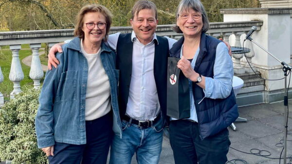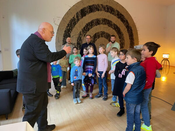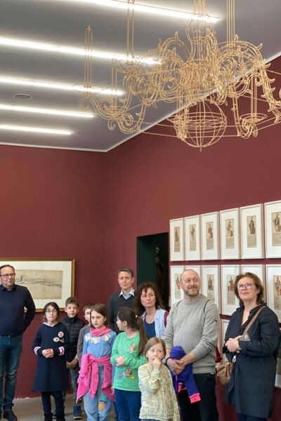 1 Nach der Begrüssung durch den Freundeskreis zeigt der Künstler Janusz Grünspek seinen "Kronleuchter" im Saal der Klever Grafen und Herzöge.