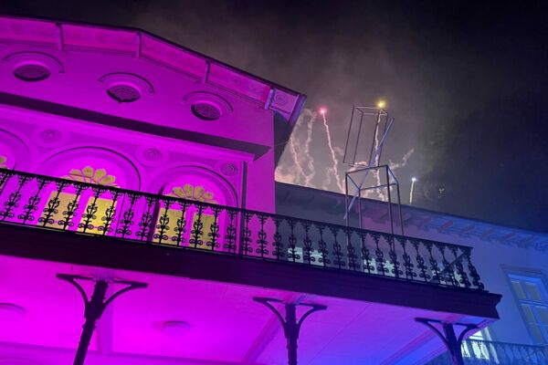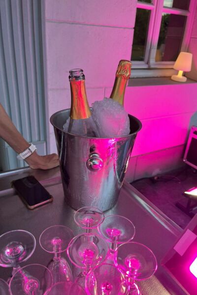 Rosé-Sekt und blau illuminiertes Museum