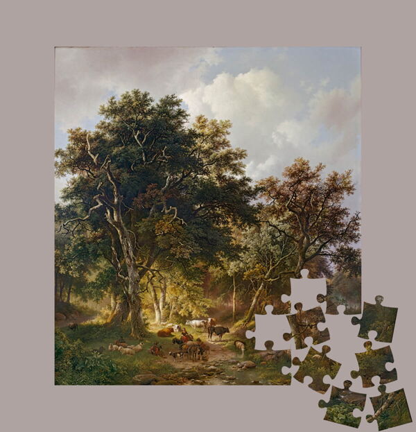 „Waldbaden“, d.h. bewusst in die Waldatmosphäre eintauchen, um Körper und Geist zu stärken, das macht man draußen in der Natur. Das kann auch beim Puzzeln der 1000 Teile von Koekkoeks Großer Waldlandschaft gelingen, wenn die mannigfaltigen Grüntöne zum großen Bild zusammengefügt sind. Das Puzzle von Bekking & Blitz gibt es im Shop des Museums zu kaufen (20€).