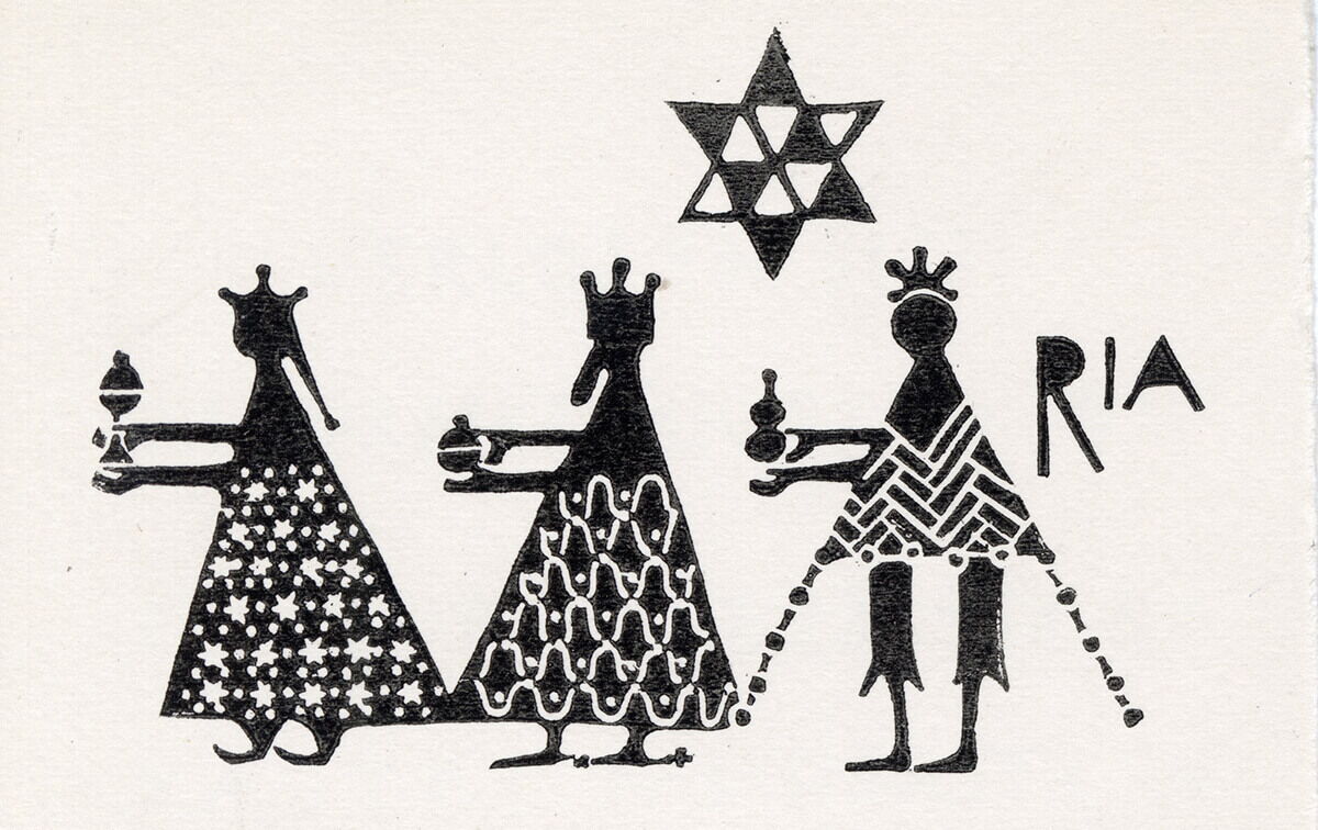 Mit wenigen grafischen Details werden die drei Könige charakterisiert: Haarzopf oder Bart, langer Mantel oder halblange Hose, Schnabelschuhe oder Reiter-Sporen und drei veschiedene Gefässe. Der Stern führt sie zu Maria, die nicht zu sehen ist. Aber ihr Name kann entdeckt werden: M A RIA.