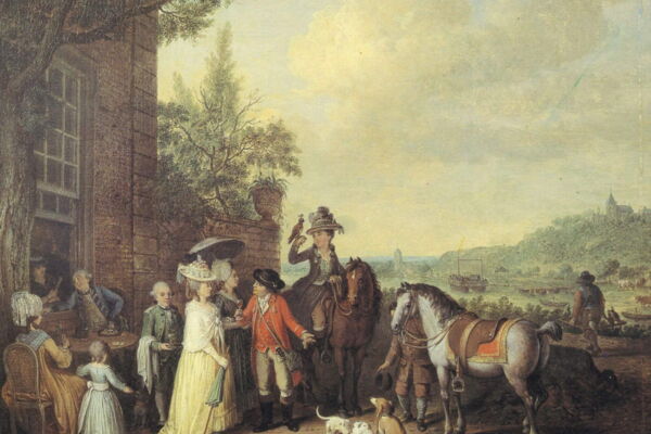 Wilhelm Joseph Laquy - Abschied an der Fähre (Prinzessin Wilhelmine von Preußen mit einer Falkenjagdgesellschaft auf die Fähre bei Spyck wartend), 1787 / MKK Dauerleihgabe des Freundeskreises, Schenkung von Dr.Tresi Sack u. Prof. Dr. Heinz Sack, Krefeld; >> Digitale Sammlung MKK