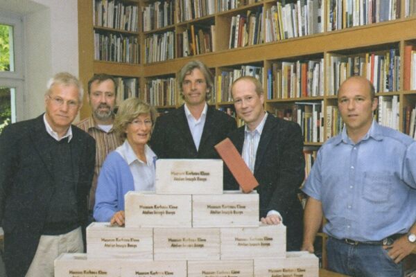 Der Stein aus niederrheinischem Ton wird in einer Schatulle aus Fichtenholz mit Brandstempel angeboten, die mit einer Handprägung nummeriert ist. Die Auflage betrug 500 Exemplare. Im Bild: Guido de Werd, Wilhelm Dückerhoff, Gisela Claßen, Christoph Wilmsen, Michael Hegholtz, Norbert van Appeldorn / Foto A. Gossens.