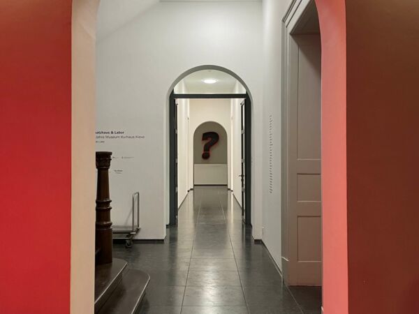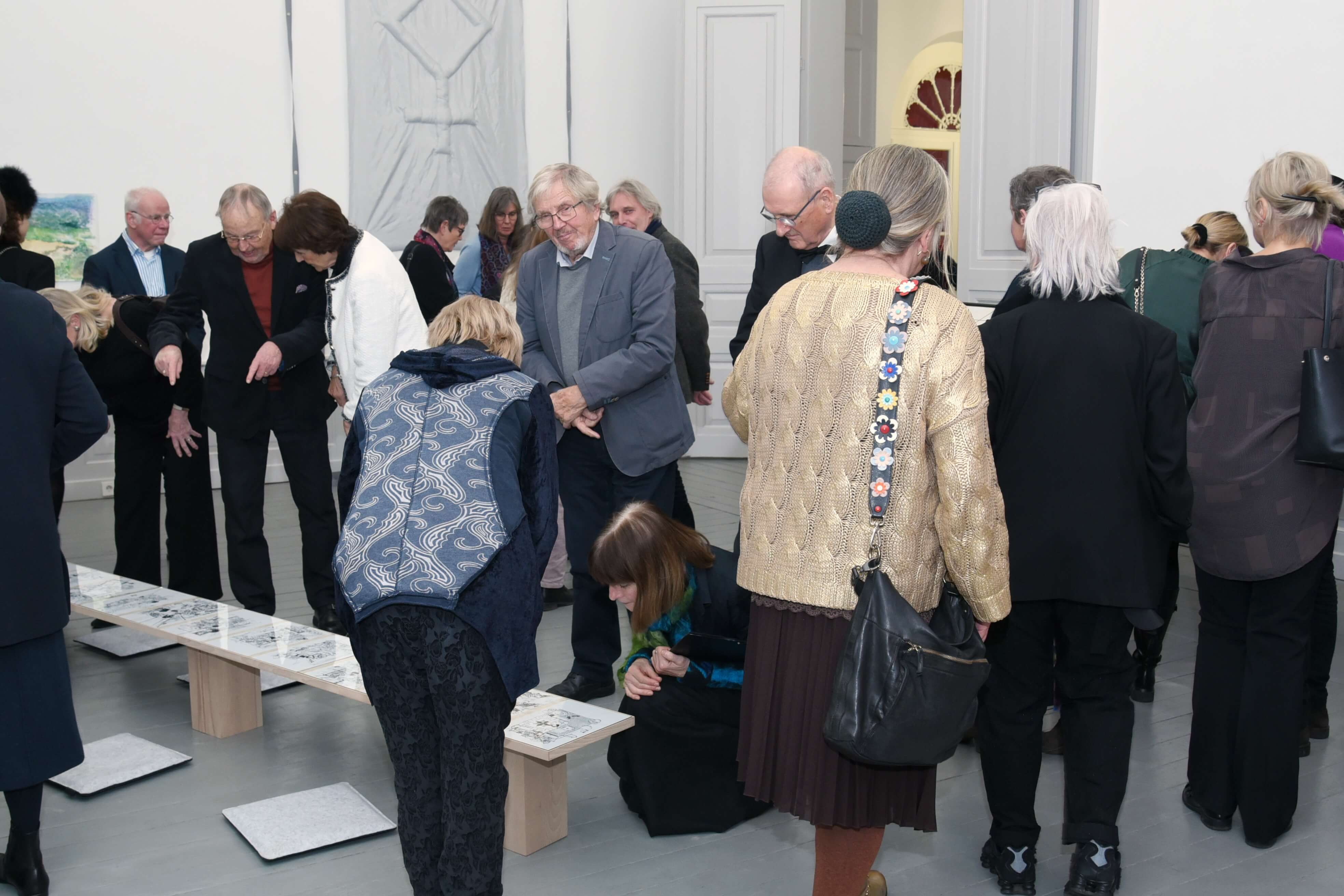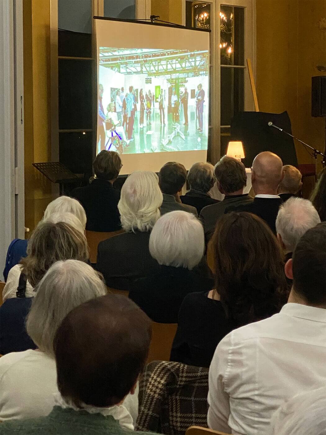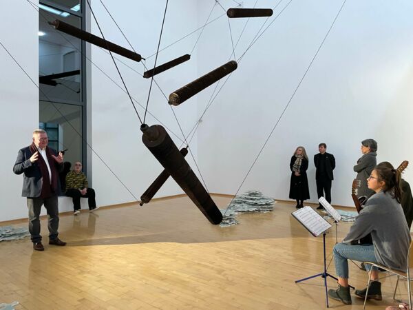 Im zweigeschossigen Saal eröffneten Lea Kasten und Helen Heusipp, Schülerinnen der Musikschulen des Kreises Kleve e.V. aus der Klasse von Margot Dellmann-Storm, mit Gitarrenklängen. Anschließend gab Harald Kunde kunsthistorische Einblicke zur Rauminstallation Vermutung 722 von Franka Hörnschemeyer (zur Ausstellung: Schatzhaus und Labor - 25 Jahre Museum Kurhaus Kleve)