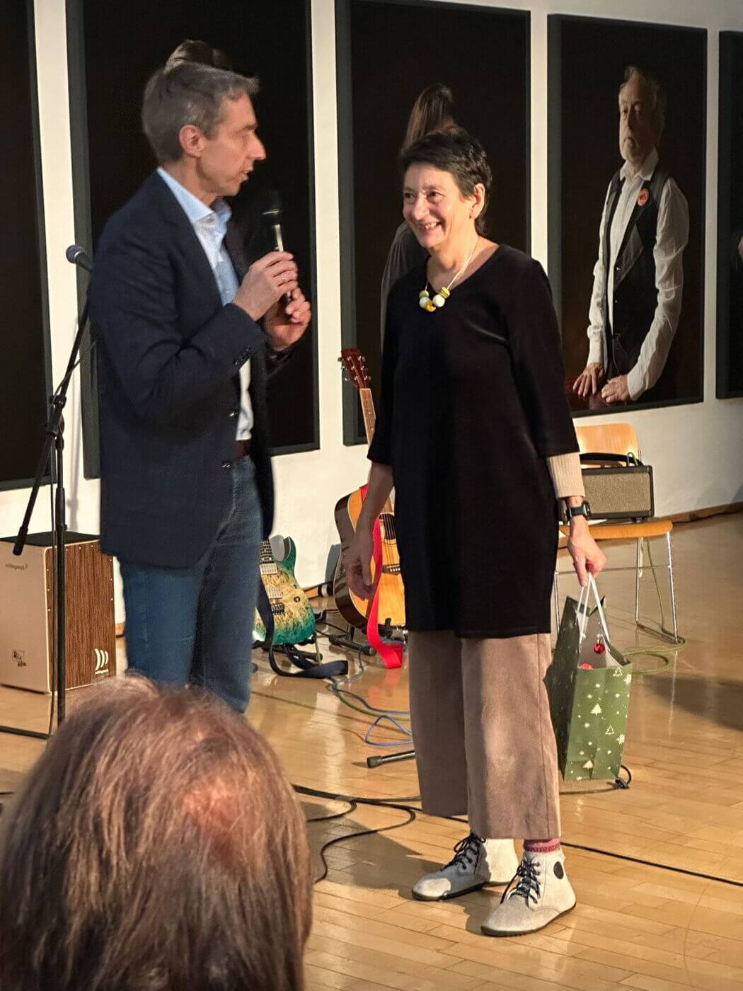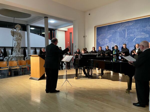 Der Chor aus Mitgliedern der Städtischen Singgemeinde Kleve sang unter Leitung von Stefan Burs Ausschnitte aus dem Konzert Et in Terra Pax, das am 11.12.2022 in Emmerich aufgeführt wurde: Das alte Adventslied Maria durch ein Dornwald ging, ein englisches Winterlied In the bleak midwinter und das ukrainische Lied Schtschedryk. Am Flügel begleitete Philipp Hövelmann.