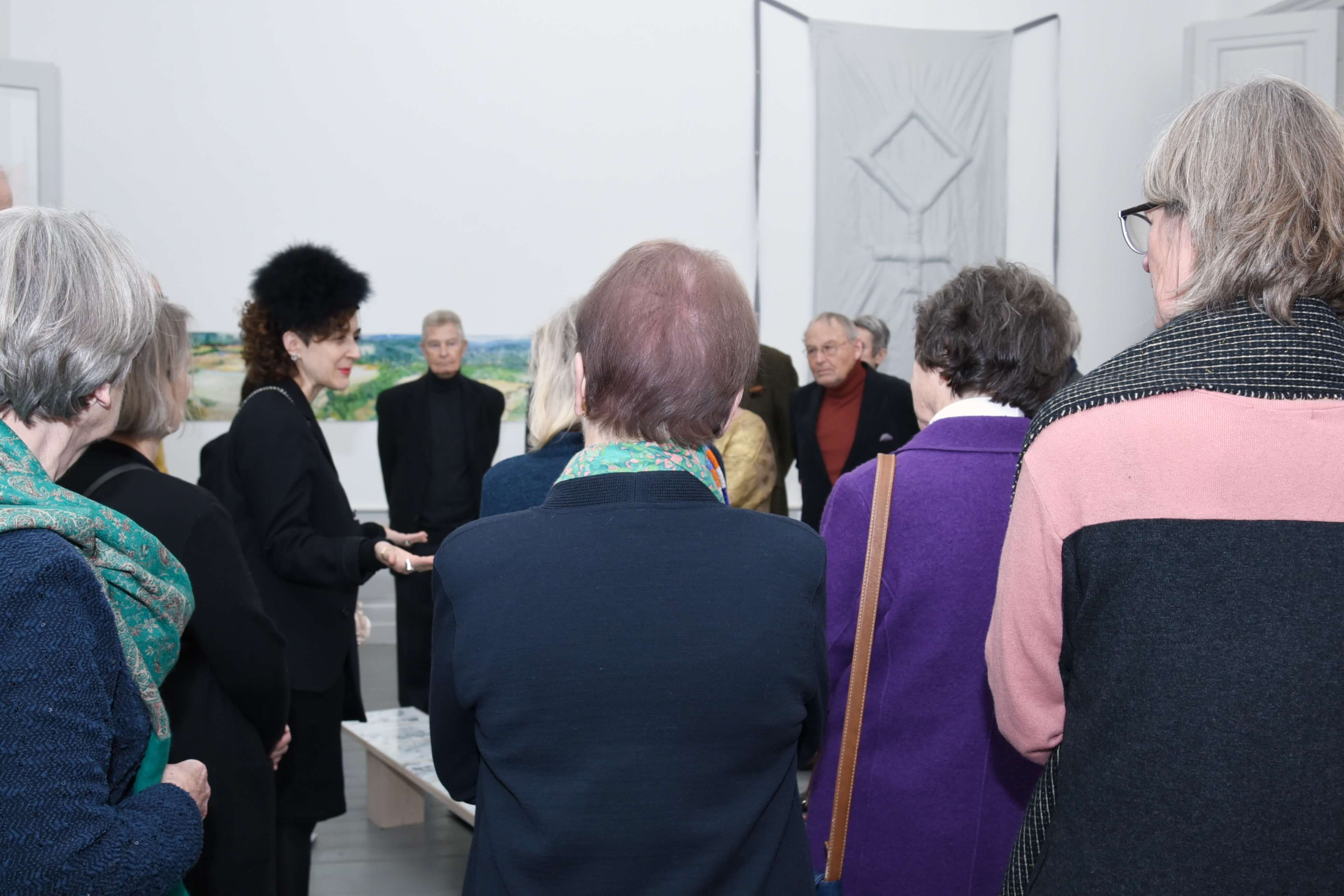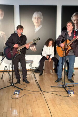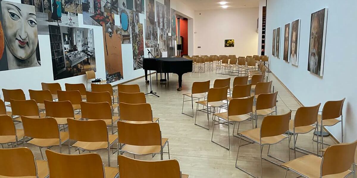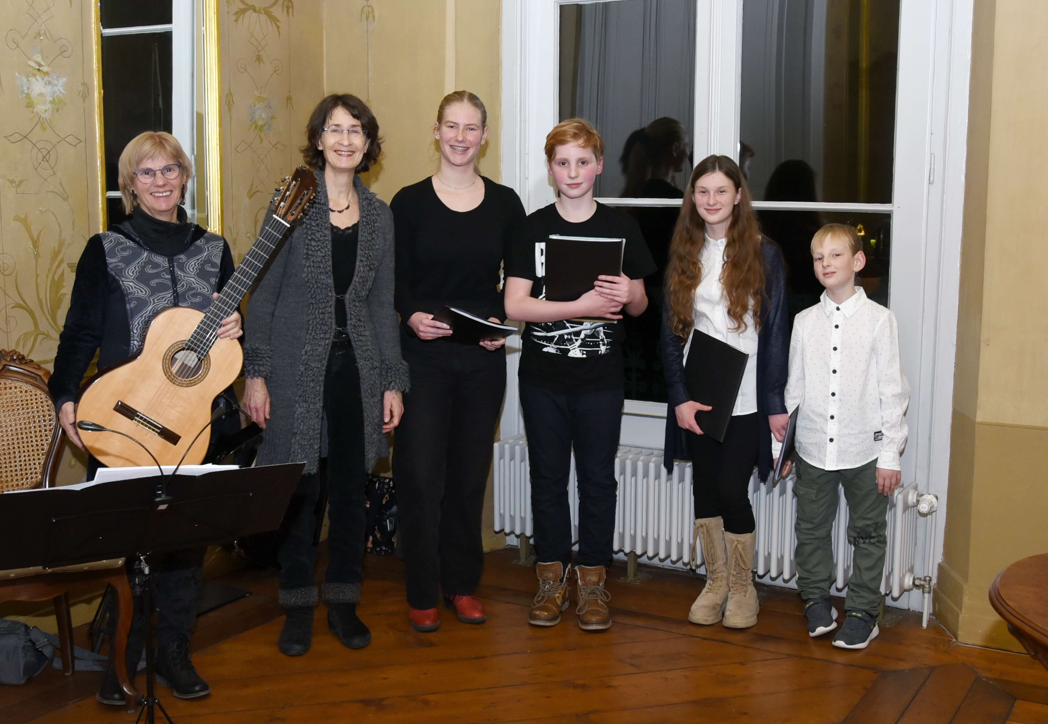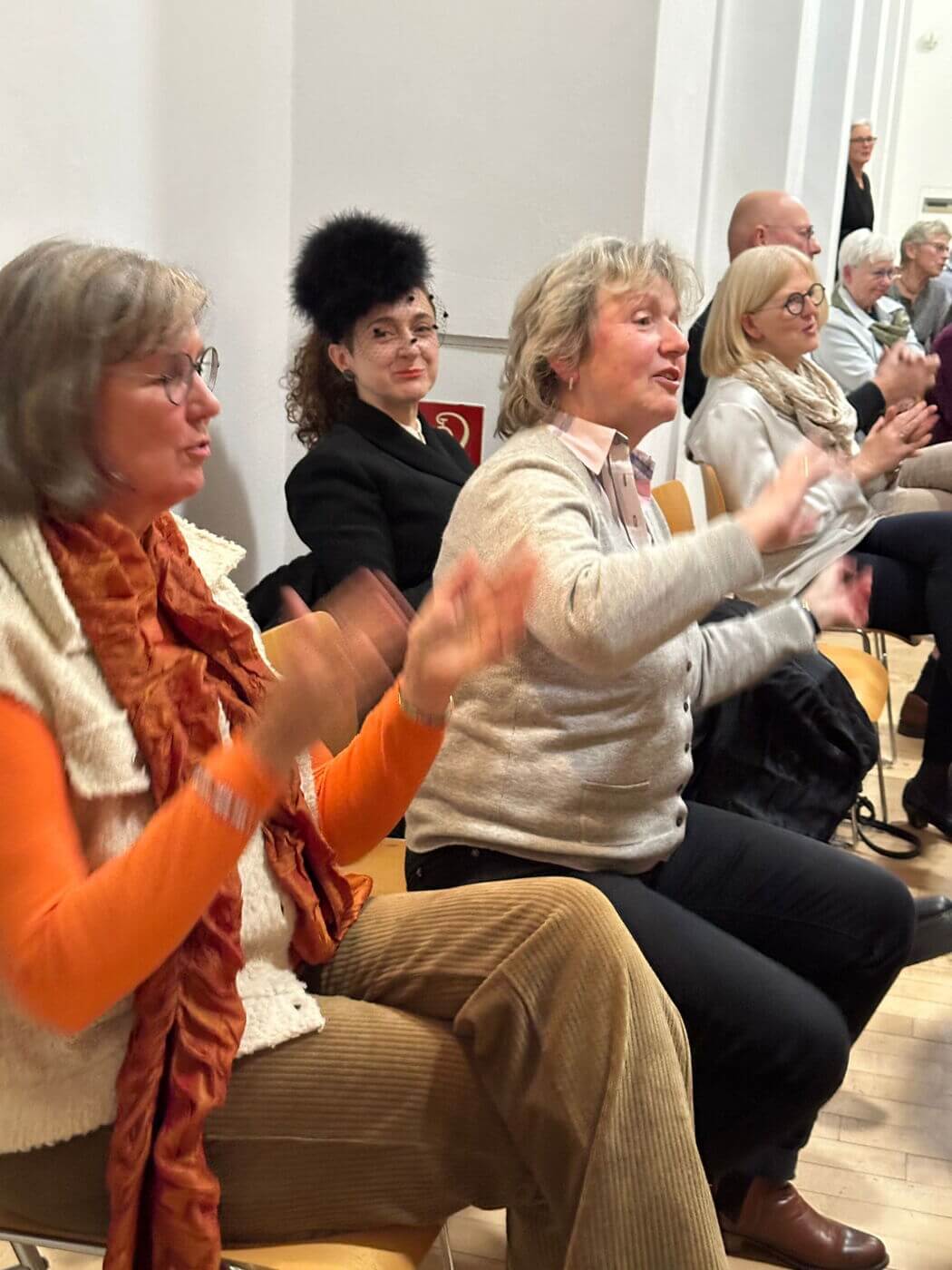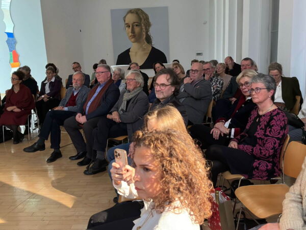 Das Hochzeitszimmer im Friedrich-Wilhelm-Bad bot den stimmungsvollen Rahmen für das Gesang Ensemble der Musikschulen des Kreises Kleve unter Leitung von Franziska Dieckmann mit Jurij Roganskij, Yeva Shyrobokova, Yelisei Shyrobokov und Emely Minervini, an der Gitarre begleitet von Margot Dellmann-Storm. Danach gab Valentina Vlašić Einblicke in die künstlerischen Gedanken, die Studierende der Kunstakademie München (Klasse Pia Fries) bei einem Projekt im Museum Kurhaus entwickelt haben (Zur Ausstellung: Zwischen Gestern und Morgen, Klasse Pia Fries).