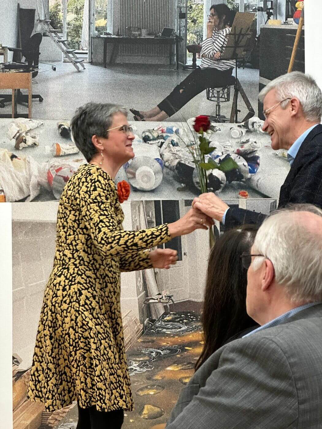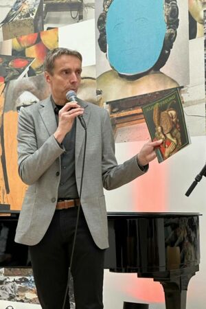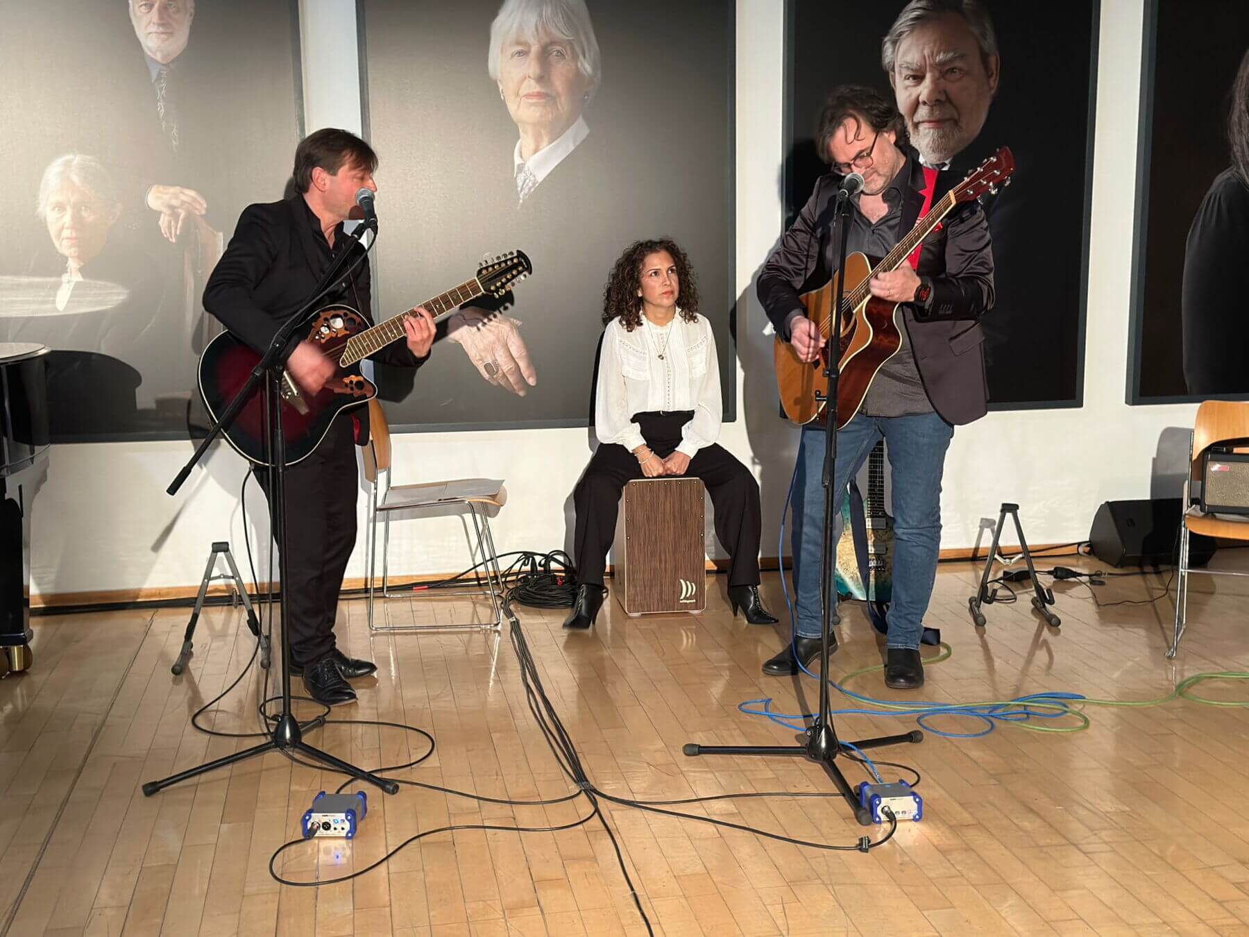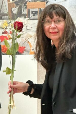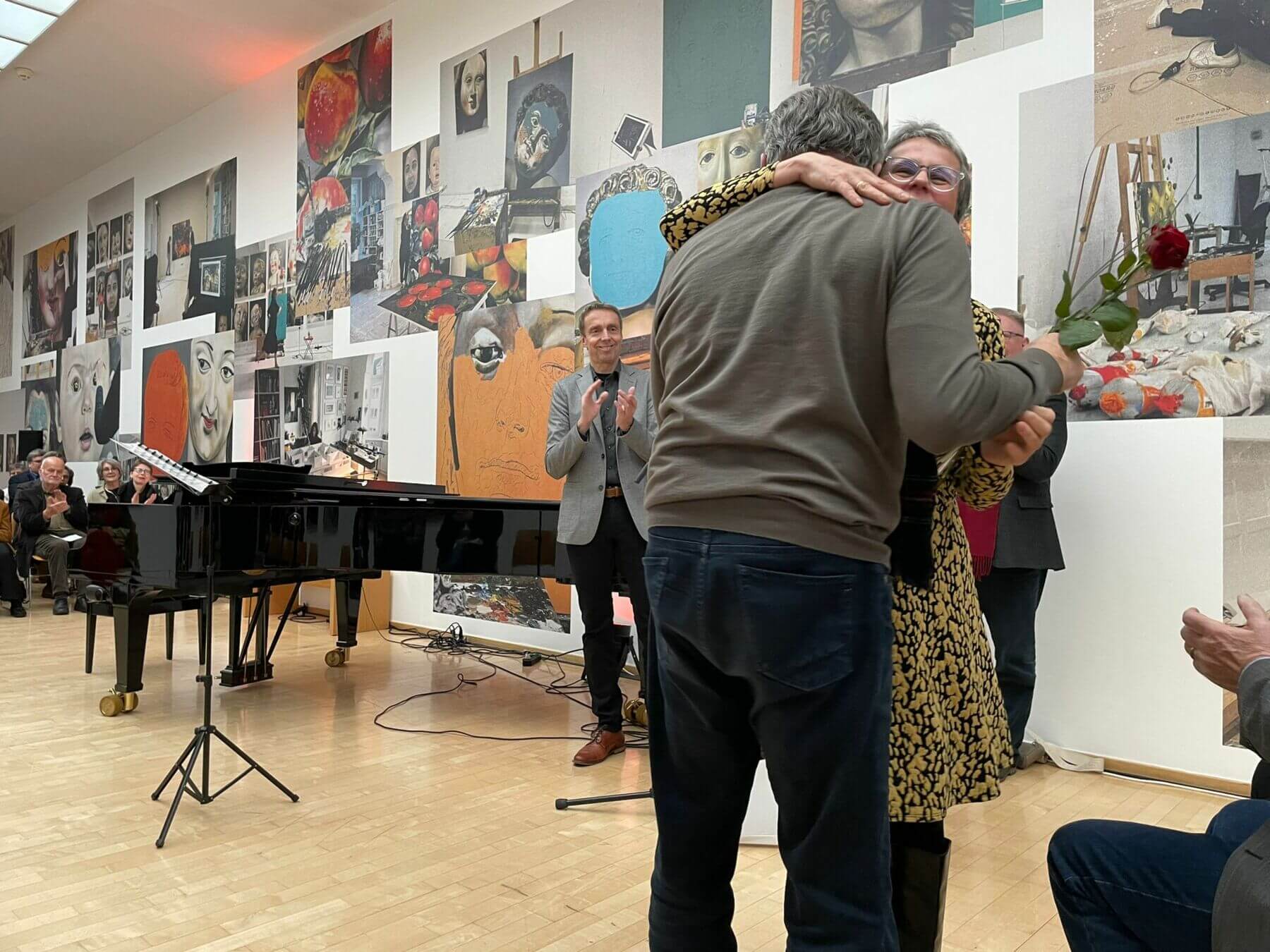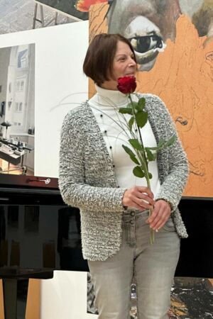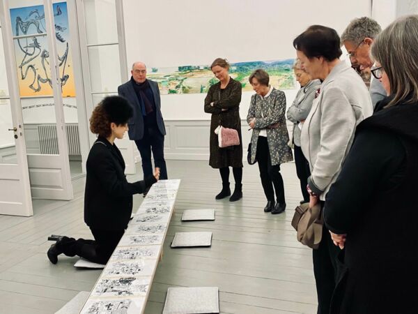 Das Hochzeitszimmer im Friedrich-Wilhelm-Bad bot den stimmungsvollen Rahmen für das Gesang Ensemble der Musikschulen des Kreises Kleve unter Leitung von Franziska Dieckmann mit Jurij Roganskij, Yeva Shyrobokova, Yelisei Shyrobokov und Emely Minervini, an der Gitarre begleitet von Margot Dellmann-Storm. Danach gab Valentina Vlašić Einblicke in die künstlerischen Gedanken, die Studierende der Kunstakademie München (Klasse Pia Fries) bei einem Projekt im Museum Kurhaus entwickelt haben (Zur Ausstellung: Zwischen Gestern und Morgen, Klasse Pia Fries).