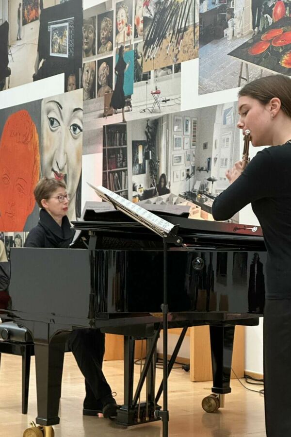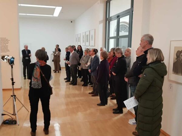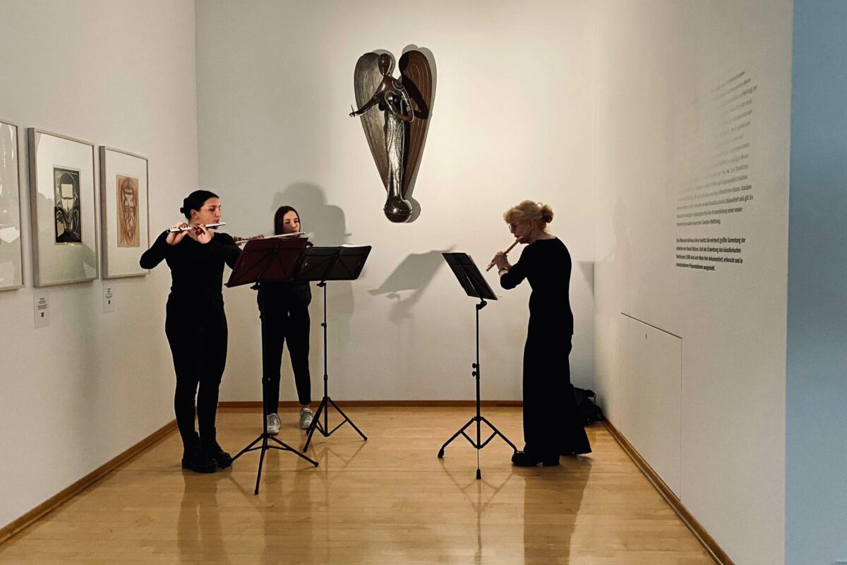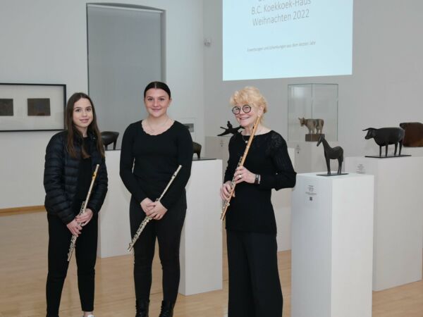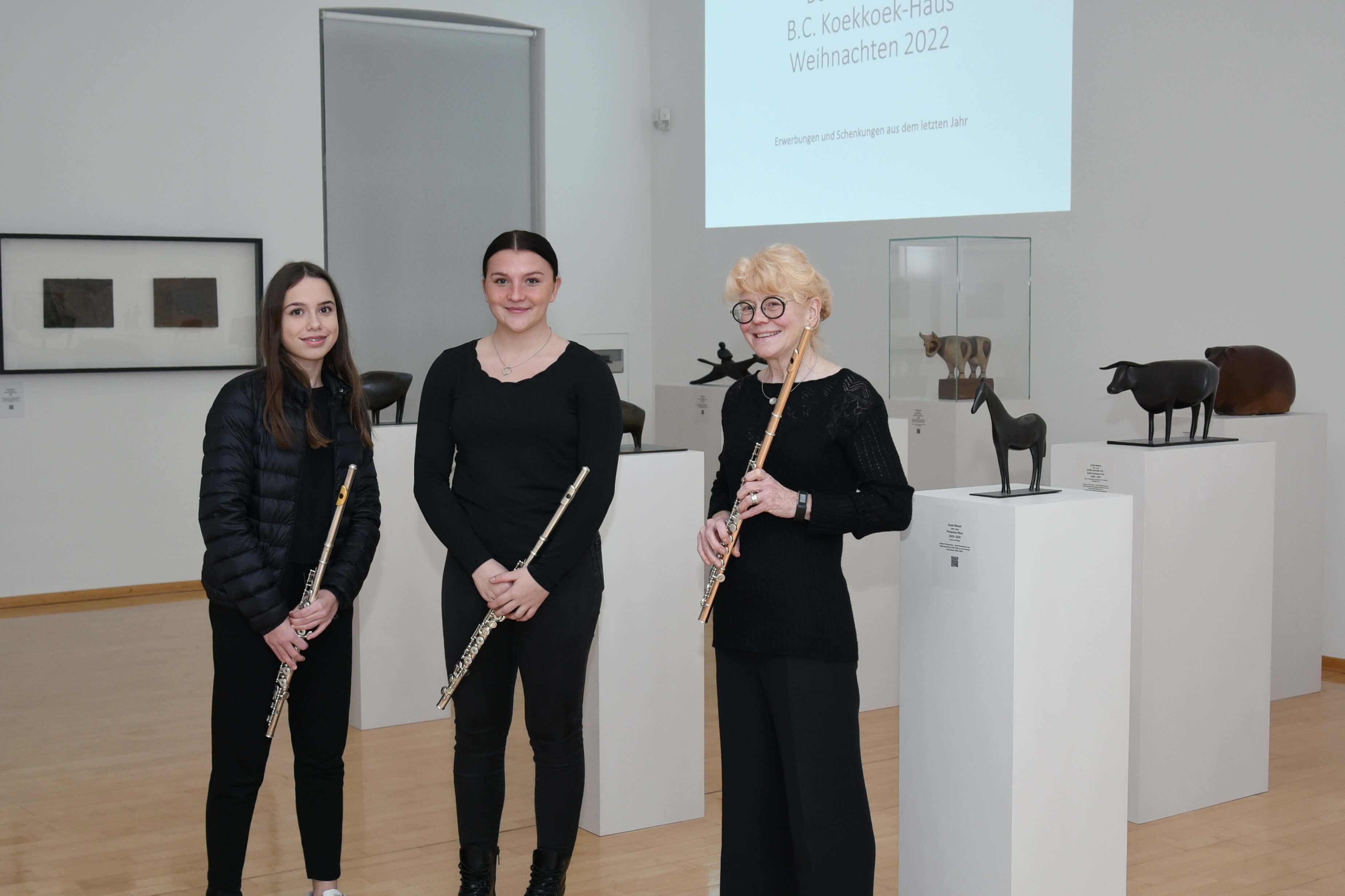 Unter dem Engel von Ewald Mataré erklangen Instrumentalstücke für drei Querflöten, vorgetragen von Lena Rütten und Hanna Wolf, Schülerinnen der Musikschulen des Kreises Kleve aus der Klasse von Frigge Wiederhold-Walter. In Vertretung von von Ursula Geisselbrecht-Capecki wurden im Anschluss die Neuerwerbungen des letzten Jahres für das B.C. Koekkoek-Haus durch Jutta Tönnissen vorgestellt.