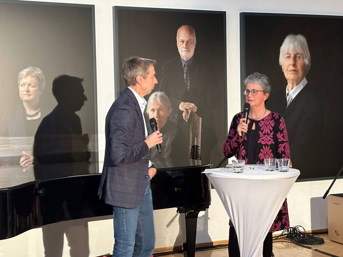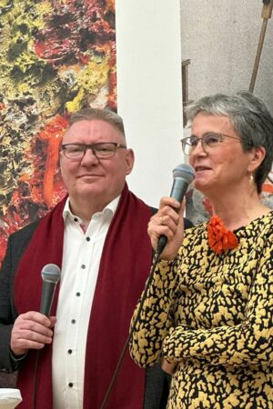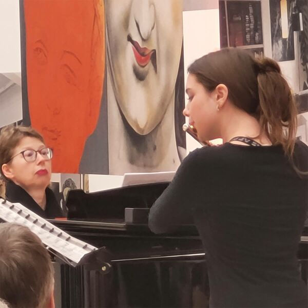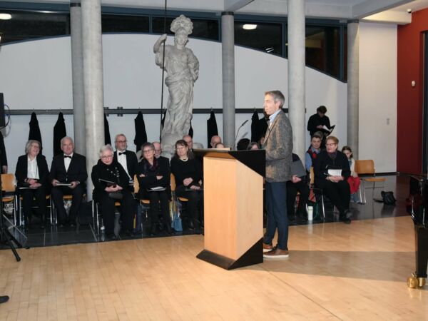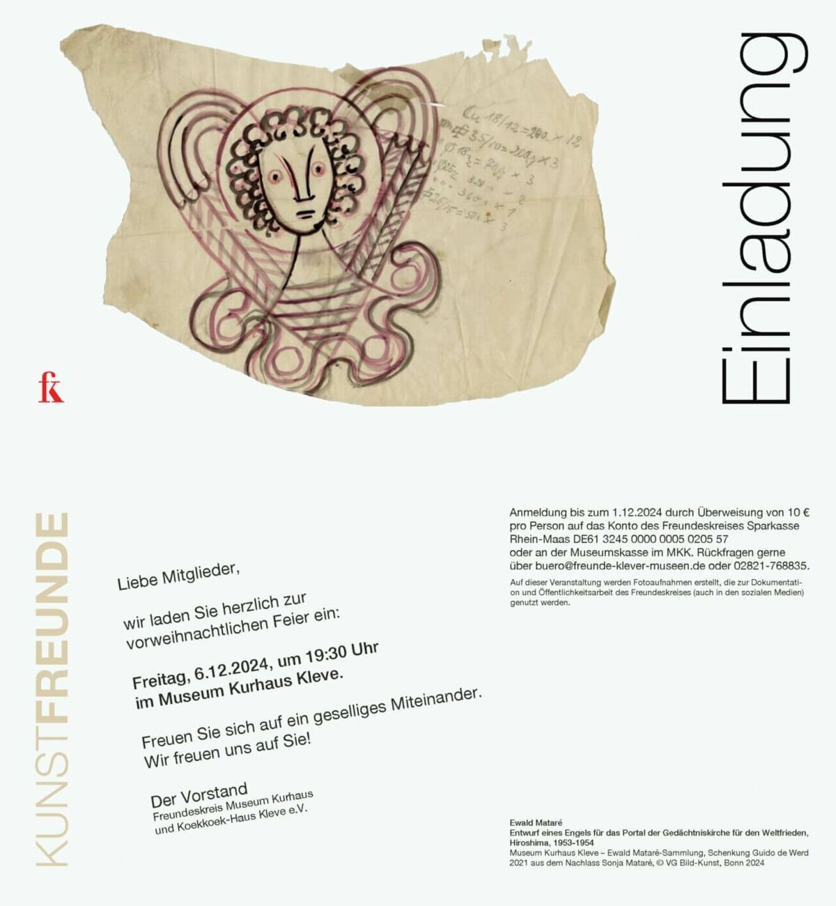 Unter dem Engel von Ewald Mataré erklangen Instrumentalstücke für drei Querflöten, vorgetragen von Lena Rütten und Hanna Wolf, Schülerinnen der Musikschulen des Kreises Kleve aus der Klasse von Frigge Wiederhold-Walter. In Vertretung von von Ursula Geisselbrecht-Capecki wurden im Anschluss die Neuerwerbungen des letzten Jahres für das B.C. Koekkoek-Haus durch Jutta Tönnissen vorgestellt.