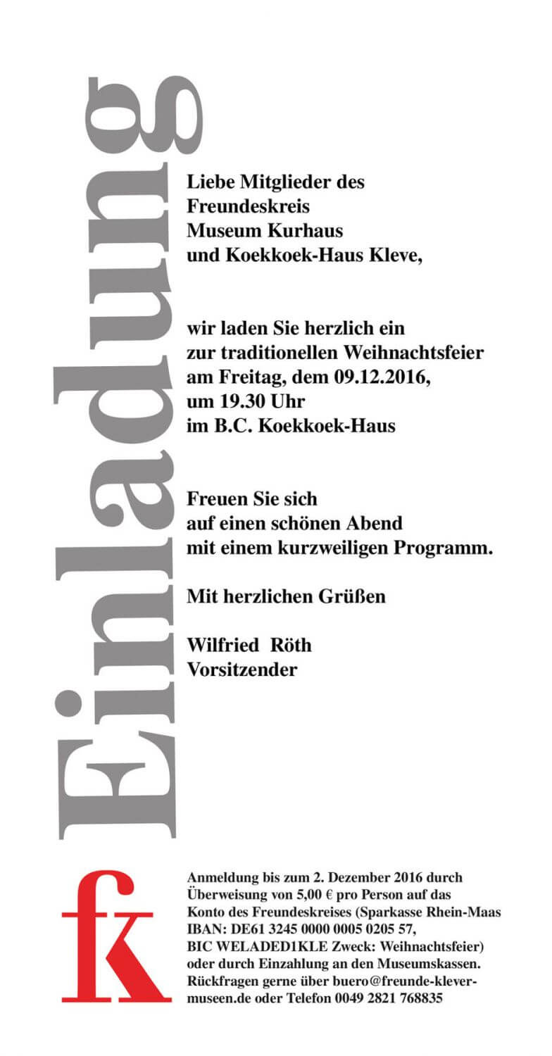 Die Mitglieder des Freundeskreises trafen sich zur traditionellen Weihnachtsfeier, die - wegen der Umbauarbeiten im B.C. Koekkoek-Haus - erstmals im Museum Kurhaus stattfand. Kunsthistorische Einblicke und Musikgenuss an verschiedenen Orten im Museum bildeten den Auftakt, dem geselliges Miteinander in der Lounge und in der Wunderkammer folgten.